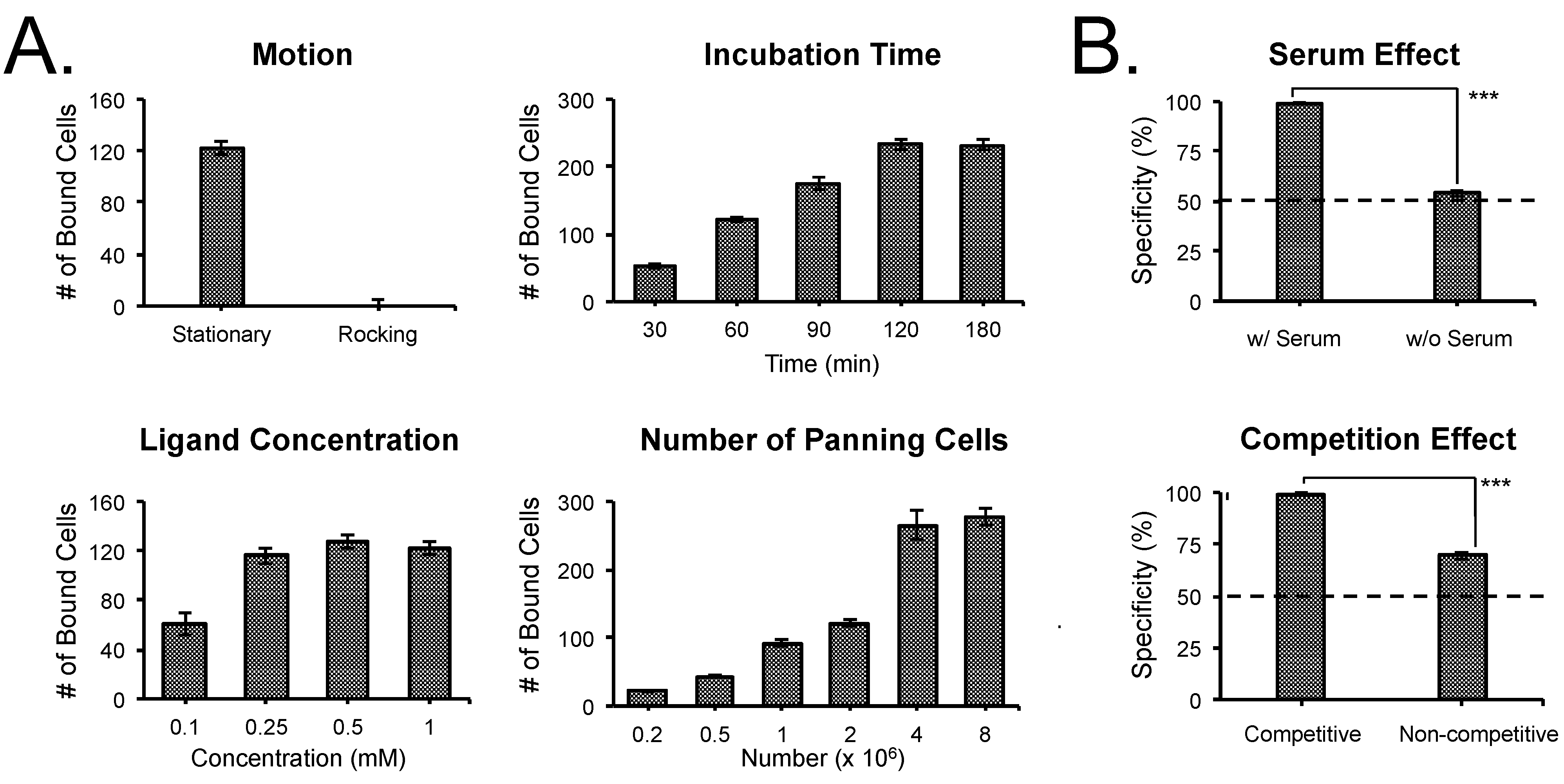 Optimization of screening parameters: (A) Maximizing sensitivity through the effect of motion, incubation time, ligand spotting concentration, and the number of panned cells using a cRGDyK array and a mixture of M21 and M21-L cells. Shown are mean ± SD for each data point from 4 randomly chosen spots on the slide. (B) Maximizing specificity through the use of serum or competing receptor-negative cells.