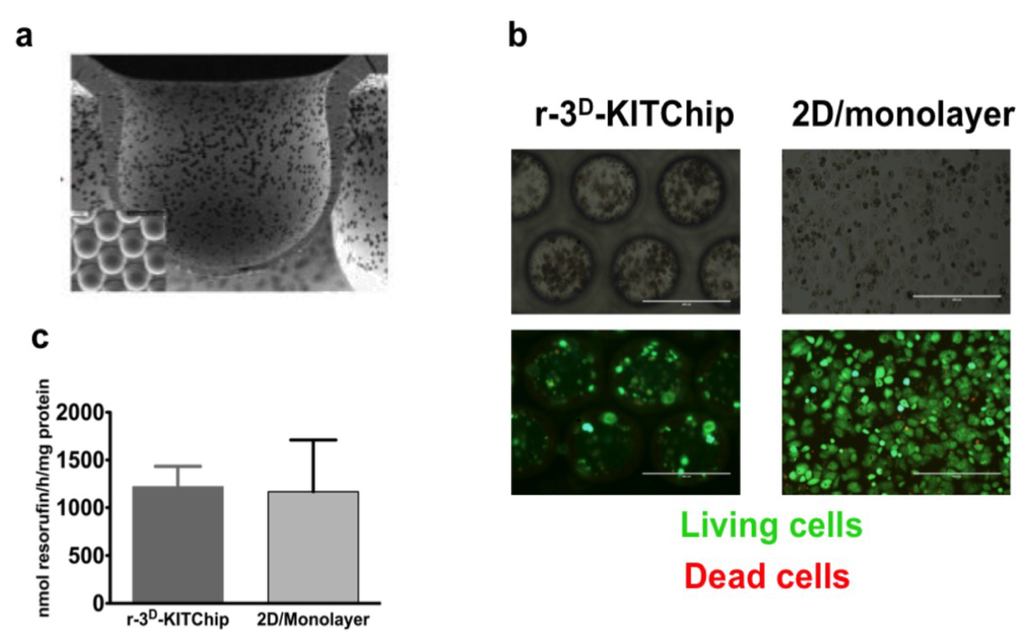 The viability of primary human hepatocytes seeded into the r-3D-KITChip. (a) Image of the cavities of the r-3D-KITChip; (b) Bright-field images of primary human hepatocytes seeded into the r-3D-KITChip and in 2D (upper part). In the lower part, dead cells have been differentiated from the living cells by staining the living cells with 2 μM Calcein AM, while dead cells were stained with 4 μM ethidium homodimer. Pictures were taken with an Evosfl microscope from Peqlab Biosystems (Erlangen, Germany). The scale bar corresponds to 400 μm; (c) In order to evaluate cell survival of primary human hepatocytes, resazurin conversion into resorufin was measured and normalized to mg protein in comparison to 2D cultivation conditions. The graphic was drawn with the GraphPad Prism software (GraphPad Software, version 5.01, San Diego, CA, USA).