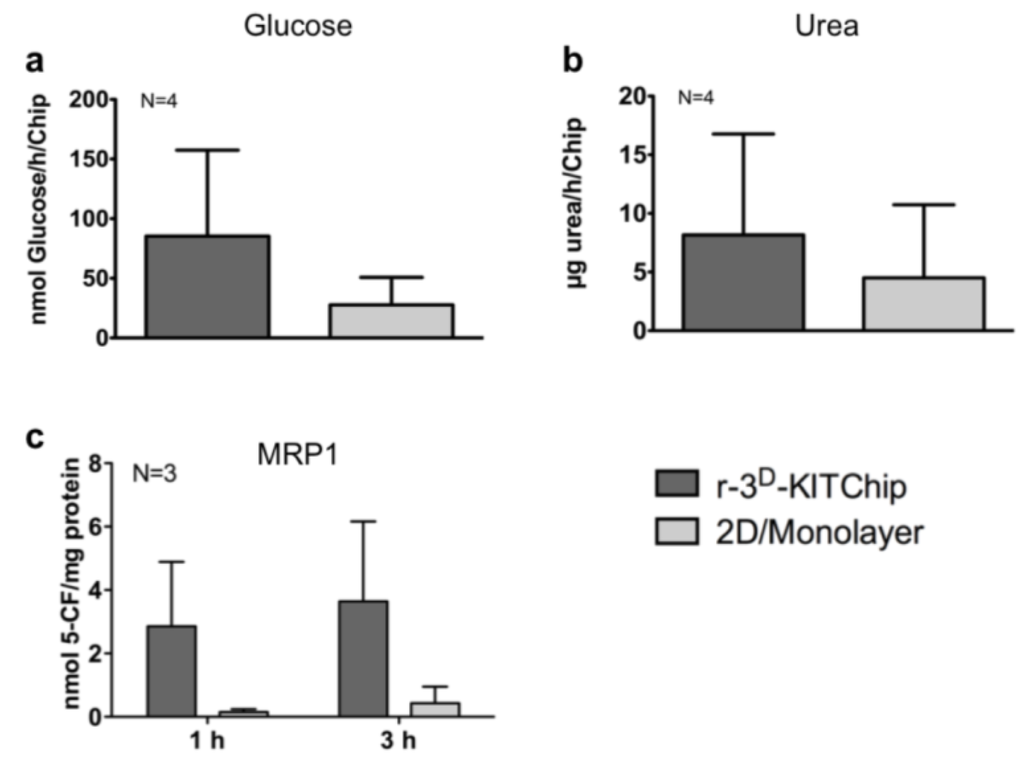 Functional parameters of primary human hepatocytes in the r-3D-KITChip and under 2D monolayer conditions on collagen coated cell culture plates. After attachment over night and perfusion for 24 h in the r-3D-KITChip, the culture medium was replaced by a buffer containing 1 mM magnesium chloride and 1 mM sodium pyruvate. The perfusion was continued for 24 h and cell culture supernatants were used for measuring basal glucose levels. (a) Basal glucose production; (b) Urea synthesis; (c) multidrug resistant protein 1 (MRP1) activity. Cells were cultivated either in the r-3D-KITChip or under 2D conditions in the presence of 5-carboxyfluorescein diacetate (5-CFDA). After uptake, 5-CFDA was metabolized into the fluorophore 5-CF, which was detected in the cell culture supernatants after the indicated time points. The graphs were drawn with the GraphPad Prism software (GraphPad Software, version 5.01). The values are depicted as mean and standard deviation of three donors.