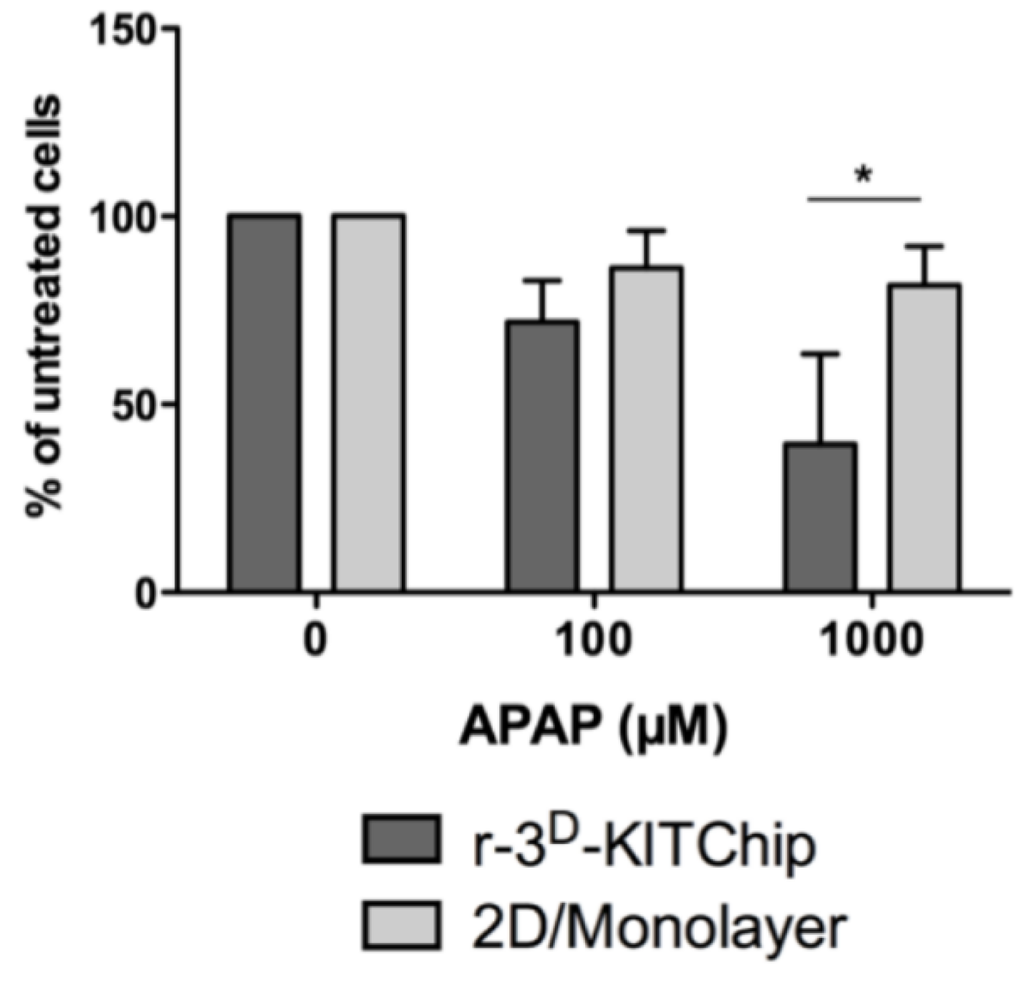 Another approach, developed by the Karlsruhe Institute of Technology (KIT), is based on a polycarbonate or polymethylacrylate polymer chip [40]. Cells seeded onto the polymer chip have generated three-dimensional structures in the porous microcavities (Figure 1a) of typically 300 µm in each direction, and the human carcinoma cell line HepG2 exhibited a higher expression of uridine-diphosphate-glucosyl-transferase and glutathione-S-transferase. Short-term cultivation of primary human hepatocytes under perfusion conditions (400 μL/h) for 24 h in these polymer chips revealed cell clustering (Figure 1b), while the cells exhibited a good viability (Figure 1c). Furthermore, primary human hepatocytes seeded into the r-3D-KITChip demonstrated a higher rate of glucose production (Figure 2a), a higher detoxification rate (Figure 2b), and a higher multidrug resistant protein 1 (MRP1) (Figure 2c) activity than cells cultivated under 2D monolayer conditions. These differences between the two cultivation systems were even more pronounced when primary human hepatocytes were stressed by 100 μM and 1000 μM acetaminophen (Figure 3). Hepatocytes cultivated in the r-3D-KITChip under a continuous flow displayed a significantly higher sensitivity towards acetaminophen-induced intoxication, confirming our previously published data on static 3D culture [3].