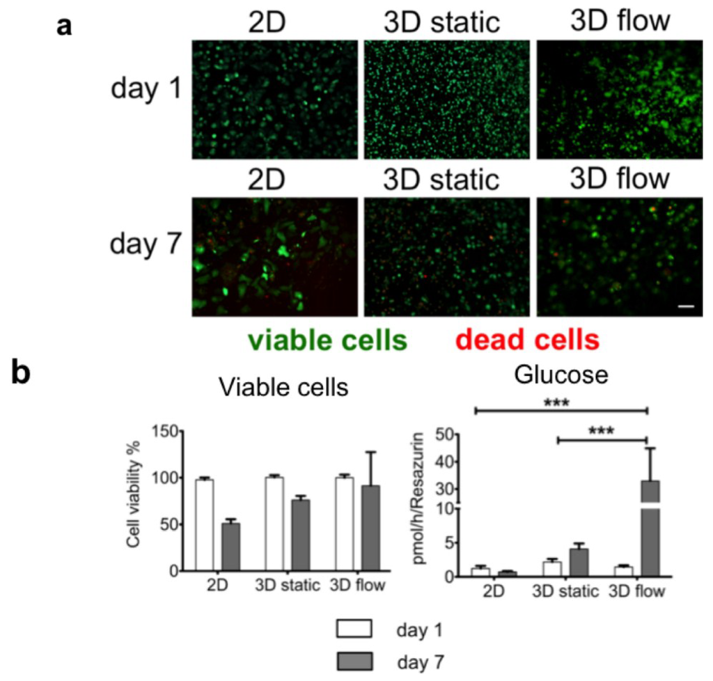 Primary human hepatocytes entrapped in rat-tail collagen combined with continuous flow in the µ-Slide VI 0.4 show a higher viability and glucose production. Cells were either seeded in 2D or 3D in 96-well plates (2.5 × 104 cells/well) or entrapped in collagen in the µ-Slide VI 0.4 (1.5 × 105 cells/µ-Slide VI 0.4) and cultivated for 1 day or 7 days. To evaluate cell viability, the cells were stained either with 2 μM Calcein AM to visualize living cells or with 4 μM ethidium homodimer to visualize dead cells, while the turnover of resazurin to resorufin was measured in parallel. The glucose production was measured from cell culture supernatants. (a) Live/dead staining of primary human hepatocytes on day one and day seven. Pictures were taken with an Evosfl microscope from Peqlab Biosystems (Erlangen, Germany); (b) Comparison of resazurin turnover and glucose production. Cell viability is depicted as % of viable cells compared to day one. The graphs were drawn with the GraphPad Prism software (GraphPad Software, version 5.01). The values are depicted as mean and standard deviation of three donors/experiments.