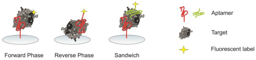 Aptamer microarrays can be performed in different formats (phases), see Figure 2. A literature overview is given in Table 2.
