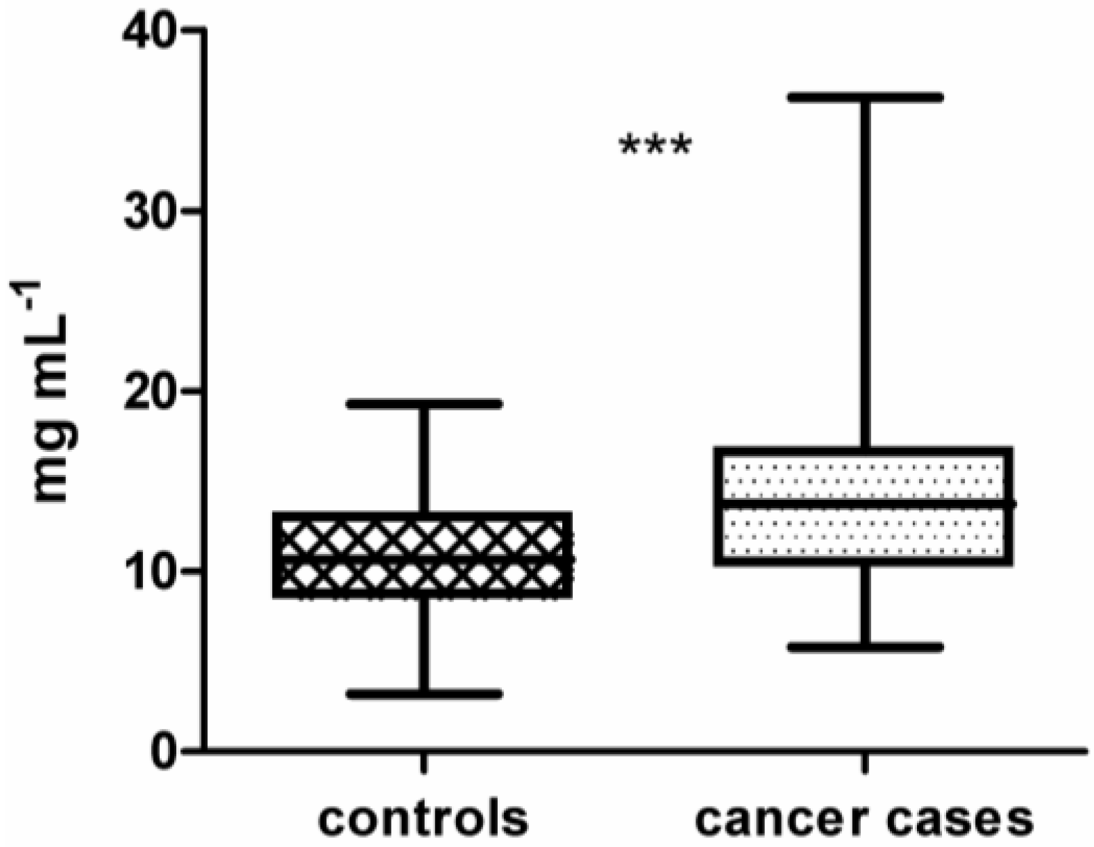 Boxplot of immunoglobulin G (IgG) concentrations from plasma of 100 controls (10.9 mg mL−1 ± 0.33) compared to 100 lung cancer cases (14.1 mg mL−1 ± 0.47). IgG concentrations of cases and controls are significantly different (unpaired t-test, p < 0.0001). Significance is indicated by asterisks (*** for p-value <0.001).