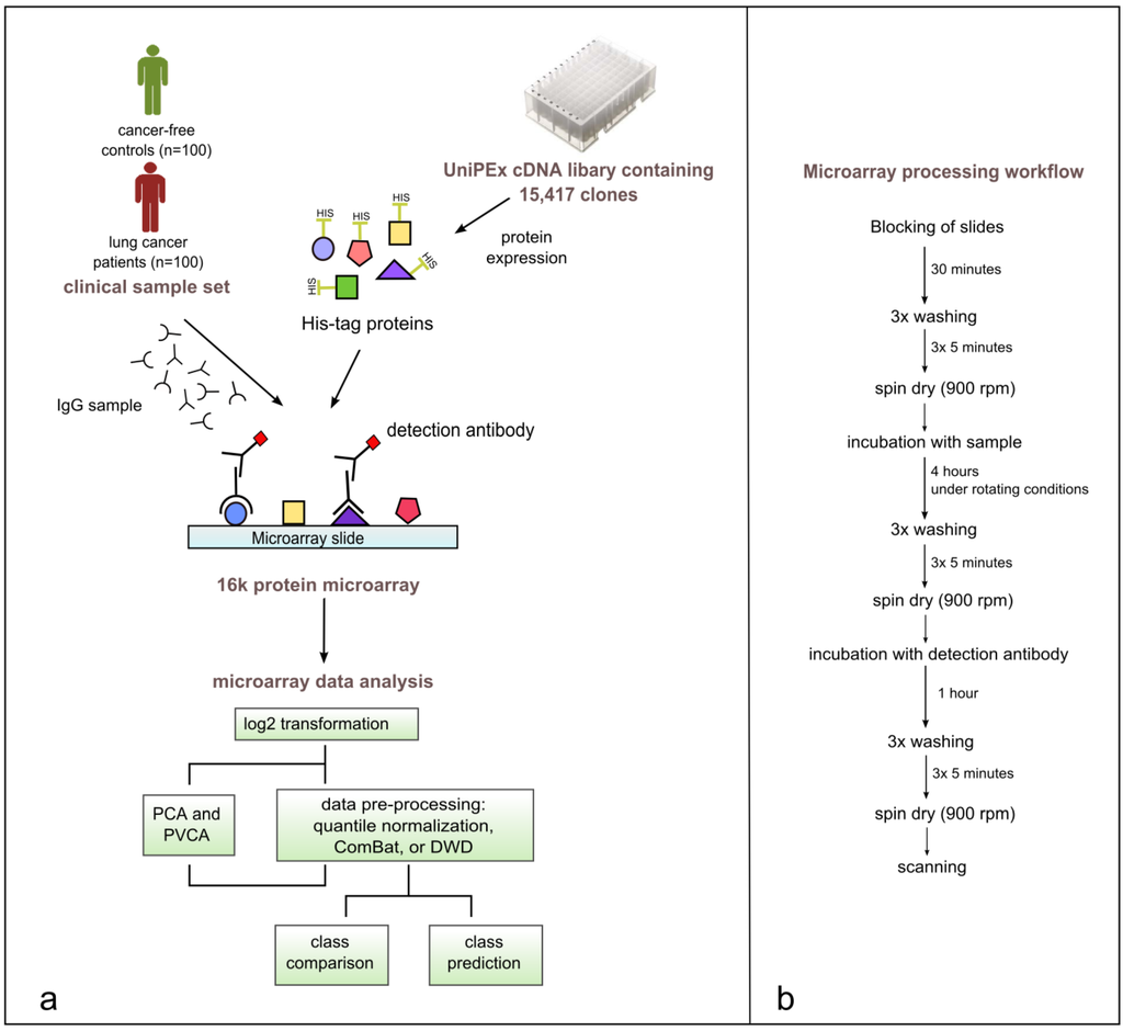 (a) Study workflow including the production of 16k protein microarrays, array processing with 200 clinical samples, data pre-processing, data visualization, and statistical analysis of microarray data using BRB-ArrayTools. (b) Illustrated microarray processing workflow.