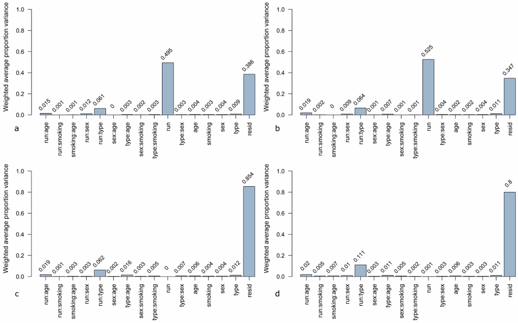 A novel method for estimation of sources for variability in microarray data is principal variance components analysis (PVCA). In this analysis, a threshold for the percentage of variability is defined and the number of principal components representing this percentage is included in the further steps [34]. Here, the threshold was set to 60%. The defined principal components (PCs) are matched to known sources of variation by variance component analysis (VCA). The resulting weighted proportion of variance shows the proportional effect of each source on the data set [28]. The PVCA analysis of the unnormalized data (Figure 4a) shows that the highest contribution (49.5%) to variation is due to the experimental run. The second highest contribution is due to undefined residual effects (38.6%) which represent the variance in the data set which cannot be explained by known factors. The third most weighted variance is contributed by the combination of experimental run and sample type (lung cancer case or control). When using quantile normalization (Figure 4b), the contribution of the experimental run increases to 52.5%. This effect can be reduced to 0% when using ComBat (Figure 4c) and to 0.001% by means of DWD (Figure 4d). The combination of the effects “experimental run” and “sample type” remain similar when using quantile normalization and ComBat, only with DWD a slight increase to 1.11% can be observed. Other factors, like age, sex, and smoking habit, do not have any effects (0.02%–0.06%) independent of the data pre-processing method. The sample type (lung cancer case or cancer-free control) has just a slightly higher effect on variance in each data set (0.11%–0.12%).