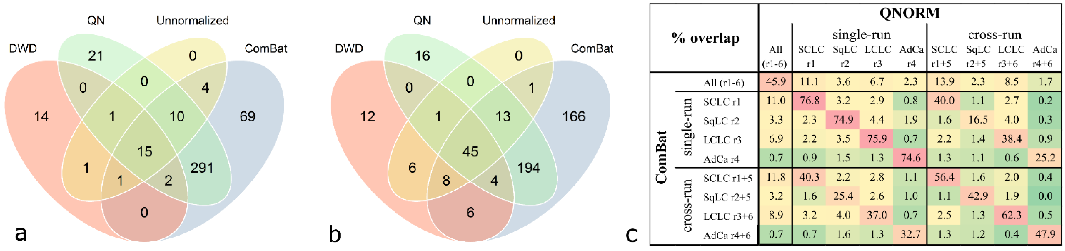Overlap (%) of significant antigens between single-run and cross-run class comparison analysis (p < 0.001). This calculation was done with the same data set in an unnormalized state, quantile-normalized, DWD-adjusted data, and ComBat-adjusted data. SCLC = small cell lung cancer, SqLC = squamous cell lung cancer, LCLC = large cell lung cancer, AdCa = adenocarcinoma.