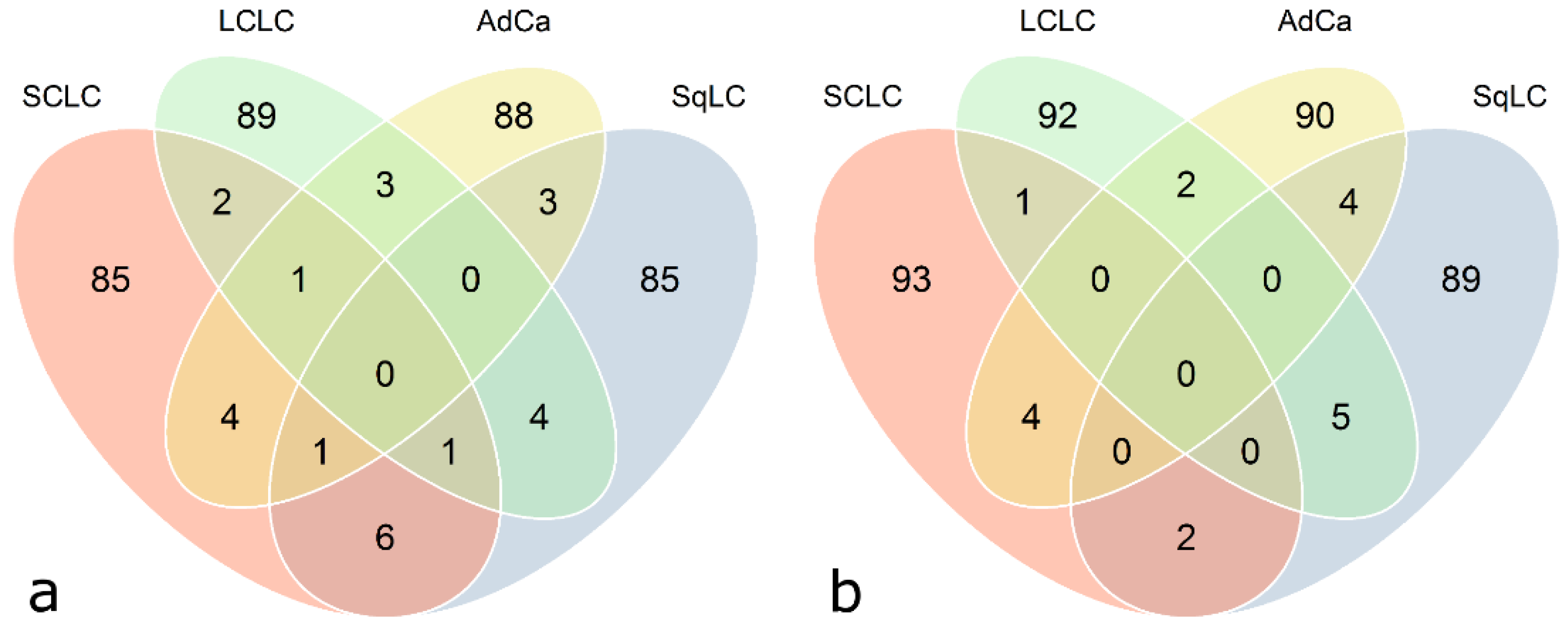 | SCLC (n = 25) | SqLC (n = 25) | LCLC (n = 25) | AdCa (n = 25) | |||