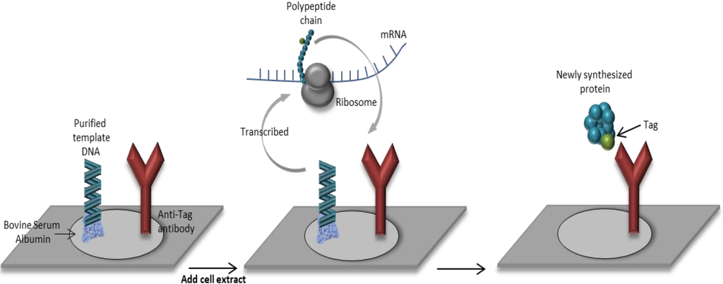 Bacteria cultures are employed as hosts for the high quality supercoiled plasmid DNA of interest. Thus, after the purification of the DNA plasmids, these are printed onto an activated ester surface along with a homo-bifunctional crosslinker (BS3, SMCC…), bovine serum albumin (BSA) and anti-tag antibody. BSA efficiently increases the DNA binding and reduces the unspecific interactions, whereas the anti-tag antibody attaches the expressed protein [10]. When the cell-free expression system is added to the array, a coupled transcription/translation reaction results and the nascent protein is linked to the capture agent tag through the C-terminal end assuring the complete translation of the protein (Figure 2). A cell-free expression system produces a protein by using biomolecular translation machinery without the usage of living cells. The reaction solution includes the transcriptional and translational molecular machinery consisting of RNA polymerases for mRNA transcription, ribosomes for polypeptide translation, tRNA and amino acids, enzymatic cofactors, an energy source, and cellular components essential for proper protein folding.