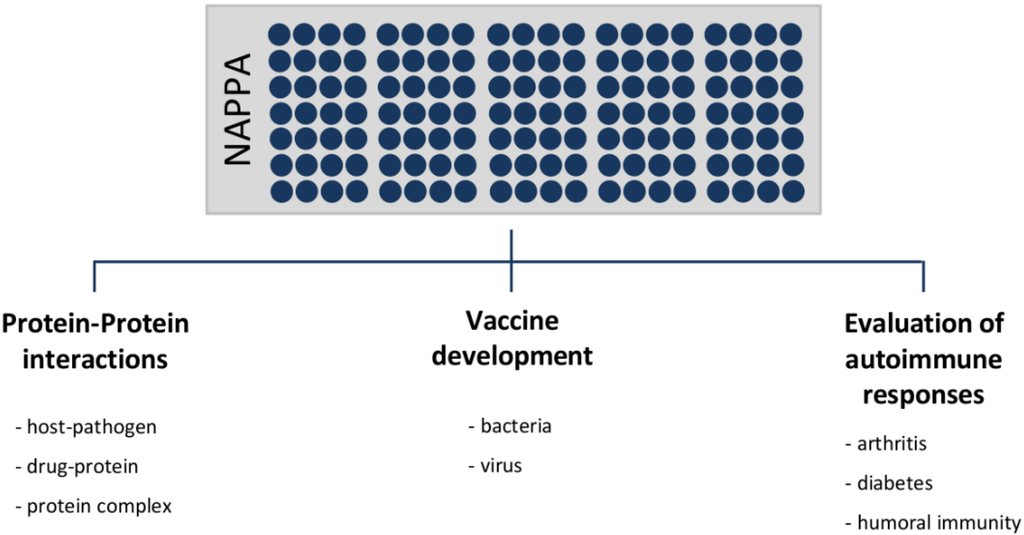 Many investigators have employed this NAPPA approach for their studies, including cancer, autoimmune diseases, host-pathogens interactions, quantification of protein binding kinetics, and infection responses to microorganisms showing a high specificity and selectivity with accurate and reproducible results. Moreover, it has been demonstrated that the platform is unbiased and independent of molecular size or protein family type.