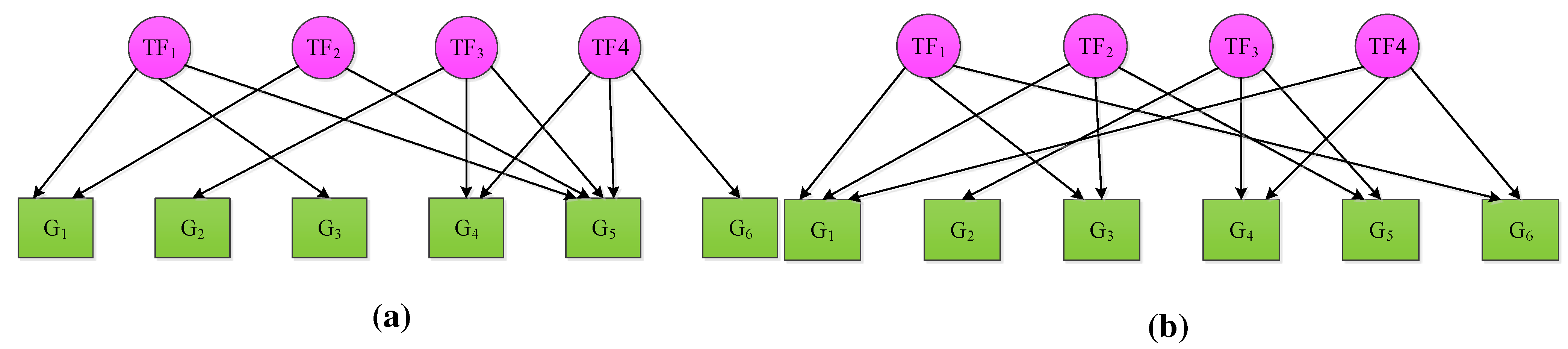 where represents the log ratios of expression values of N genes at K time points of the microarray dataset, denotes the connectivity strength between N genes and M TFs, stands for the activities of M TFs at K time points and represents the measurement noise. Examples of two TRNs with six genes and four TFs, but different connectivity topologies, are shown in Figure 1.