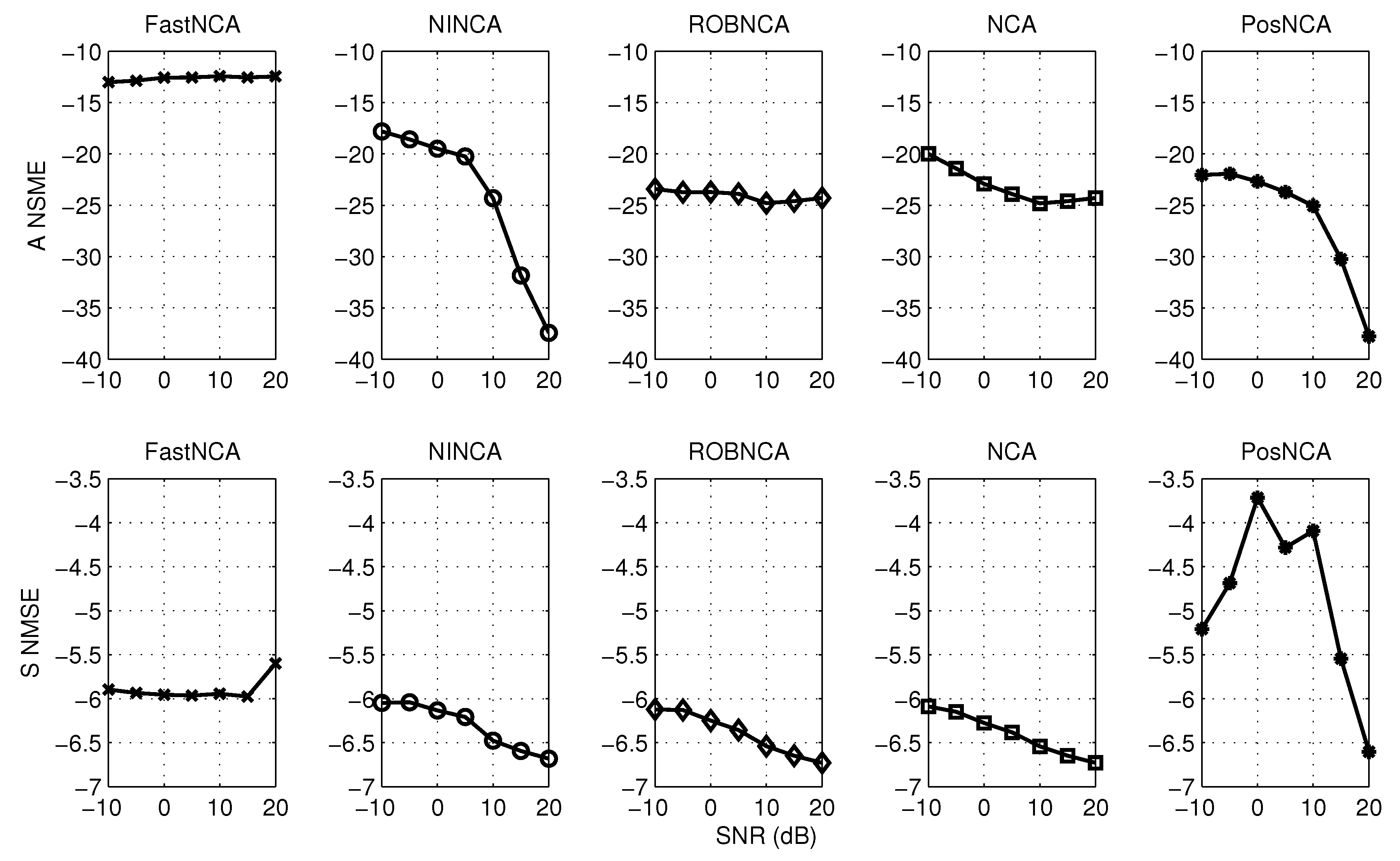 In terms of performance in the presence of additive noise, Figure 4 depicts that NINCA and PosNCA achieve a higher degree of accuracy when the SNR is high. Moreover, the performance of ROBNCA and NCA is also accurate and consistent compared to FastNCA. When the data are corrupted with both noise and outliers, according to Figure 6, ROBNCA achieves the best performance against outliers. The NSME of NINCA and PosNCA increases significantly compared to the case without outliers, especially when the SNR is high. Even though the performance of FastNCA does not degenerate when outliers exist, the NMSE is still relatively large compared to other algorithms.