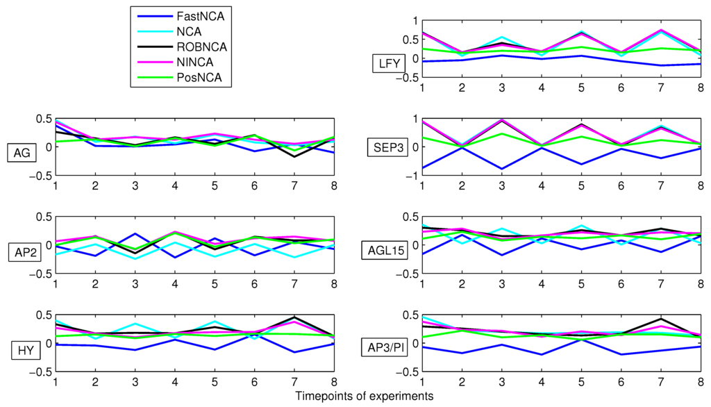 Furthermore, we also employ these algorithms to quantitatively analyze a real dataset. In particular, a plant TRN in floral development using the Arabidopsis thaliana dataset housed in the Arabidopsis Gene Regulatory Information Server (AGRIS) [37] is analyzed. The initial dataset consists of 10 TFs and 57 genes. However, only seven TFs, namely LFY, AG, SEP3, AP2, AGL15, HY and AP3/PI, and 55 genes were found to be compliant with the NCA framework [38]. The simulation results to reconstruct the aforementioned seven TFs are depicted in Figure 8. It can be seen that NCA, ROBNCA and NINCA almost obtain an identical estimate for SEP3, and they share a similar trend for the reconstruction of other TFs. On the other hand, with respect to the estimation of SEP3, the results obtained by FastNCA and PosNCA are different from those exhibited by NCA, ROBNCA and NINCA.