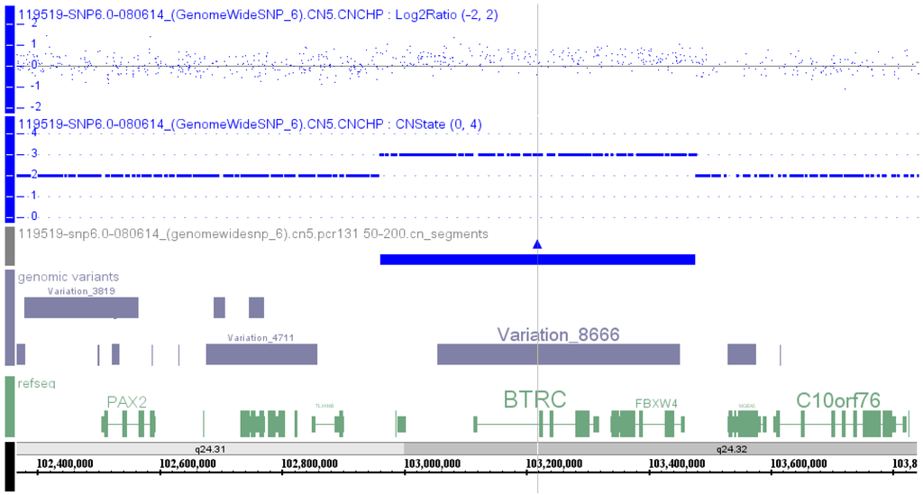 Two male patients had loss or deletion at 10q24.31–q24.32. The first patient with short phalanx of finger, abnormality of the kidney, cleft palate, intellectual disability, microphthalmos, non-midline cleft lip, pulmonic stenosis, sensorineural hearing impairment, short stature, soft skin, truncal obesity and vesicoureteral reflux had a 546.42 kb loss at 10q24.31–q24.32, which contains 13 genes from LINC01514 to a portion of FBXW4 (exon 9–2, breakpoint at intron 1) (Table S1, Patient 45). The inheritance was unknown. The second patient with aortic dilatation, median cleft palate, Pierre-Robin sequence, renal hypoplasia and secundum atrial septal defect had a de novo 389.02 kb deletion at 10q24.31–q24.32, which contains genes from BTRC to a portion of FBXW4 (exon 9–6, breakpoint at intron 5) (Table S1, Patient 46).