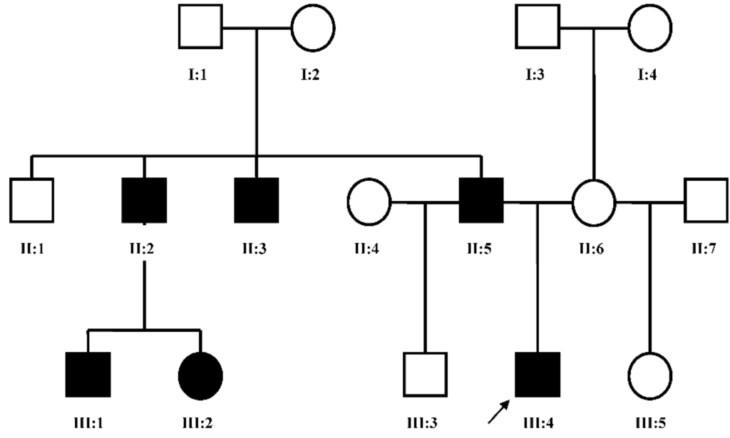 Pedigree of FH family: II:5 was examined clinically, and III:4 was examined clinically and genetically. Hollow box = normal male; black box = affected male; hollow circle = normal female; black circle = affected female; arrow = proband.