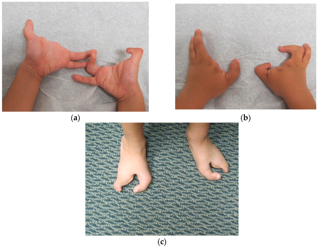 - Everman, D.B.; Morgan, C.T.; Lyle, R.; Laughridge, M.E.; Bamshad, M.J.; Clarkson, K.B.; Colby, R.; Gurrieri, F.; Innes, A.M.; Roberson, J.; et al. Frequency of genomic rearrangements involving the SHFM3 locus at chromosome 10q24 in syndromic and non-syndromic split-hand/foot malformation. Am. J. Med. Genet. A 2006, 140, 1375–1383. [Google Scholar] [CrossRef] [PubMed]