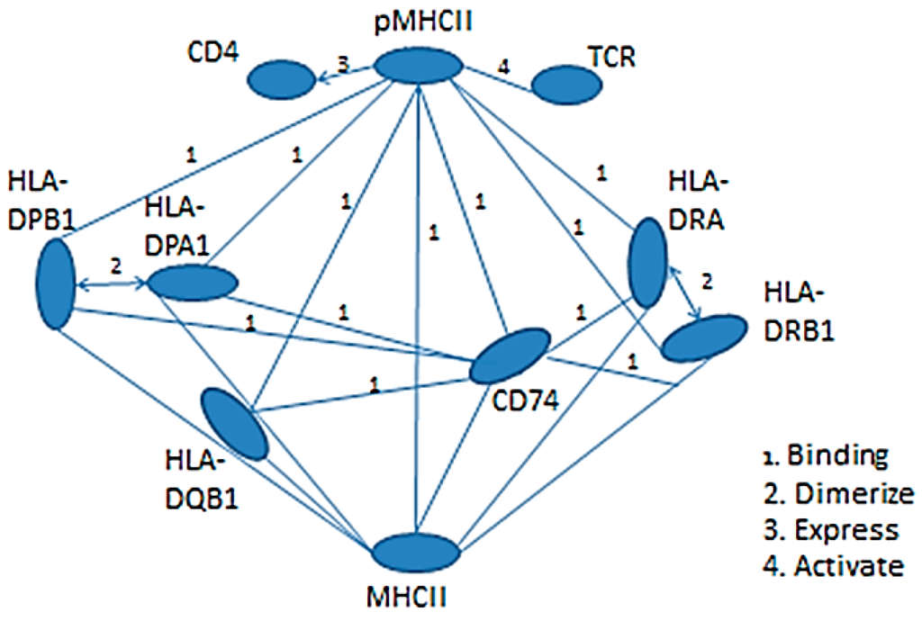 The MHC Class II are heterodimers composed of α and β transmembrane chains, such as HLA-DPA1 and HLA-DPB1, the latter a dimer that associates with the invariant chain of CD74 which forms a trimer in the endoplasmic reticulum. The trimer traffics to the Golgi compartment and then is transported to the late endosomic compartments, thereby loading the antigen peptide [25]. CD74 acts as a chaperone that regulates antigen presentation. Invariant chain of CD74 involves binding to the HLA-DPA1 and HLA-DPB1 dimers. After trafficking and targeting antigen, the invariant chain is released from MHC-II and then the antigen peptide binds [26,27]. The antigen-bound MHC-II complex moves to the plasma membrane. The plasma membrane-bound antigen-MHC II (pMHCII) interacts with T-cell receptor (TCR). TCR recognizes the antigen only when presented by foreign MHC molecules. TCR activates the pMHCII complex, and facilitate CD4 T-cell stimulation on the cell surface [28]. Crystal structure shows the ternary model of CD4-pMHCII-TCR that appears V-shaped with pMHC II at apex, but CD4 and TCR do not have direct contact. The signaling of CD4 and TCR is coordinated around the pMHCII [29]. Therefore, MHCII genes play an essential role in immune responses.