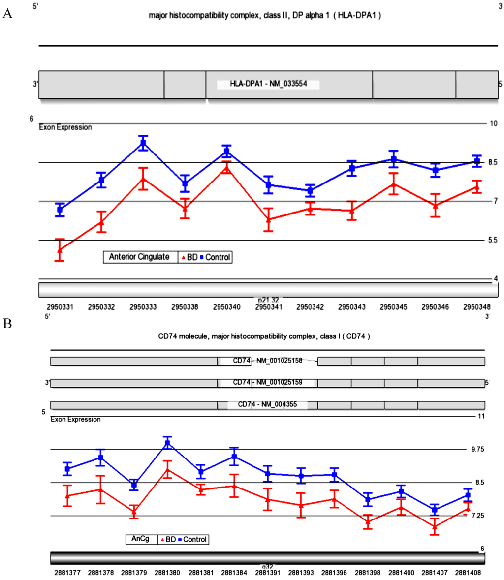 (A) HLA-DPA1 probeset shown on x-axis and probe intensity shown on y-axis in log2 scale. All probesets were significantly decreased (p < 0.05) in bipolar disorder (BD, red) compared to controls (C, blue), except two probesets (2950338 and 2950345) that were at trend level (p < 0.1). The p-values are shown in Table 4 for each probeset comparison; (B) The plot of CD74 for BD and C supports decreased expression along entire transcript.