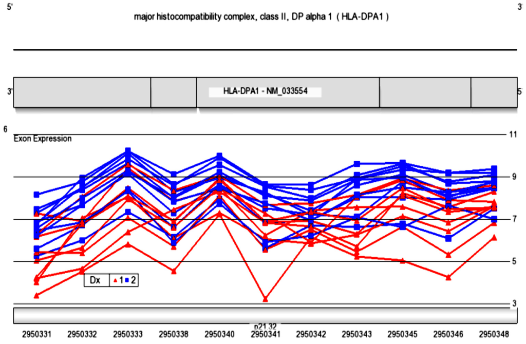 By exon array, a variable expression pattern was observed across exons 2, 3, and 4 in HLA-DPA1 for multiple subjects. This gene was therefore chosen for analysis of alternative splicing by direct sequencing of gel-purified cDNA amplicons to evaluate potential variants.