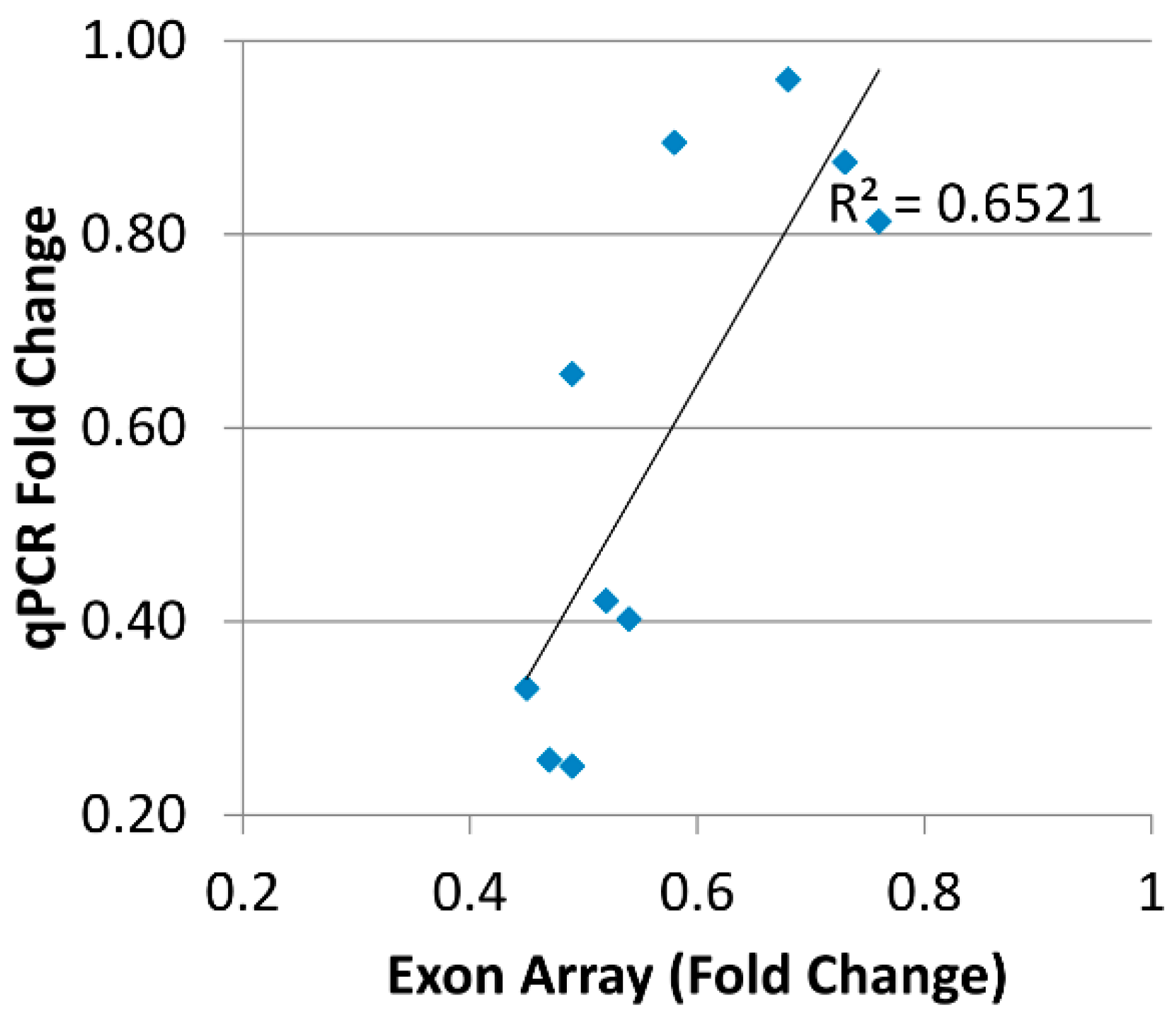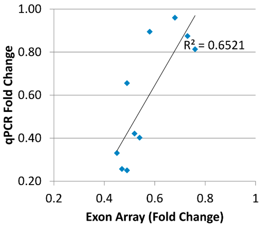 Comparison of fold change results for qPCR (y-axis) and Affymetrix exon array (x-axis) based upon genes shown in Table 5.