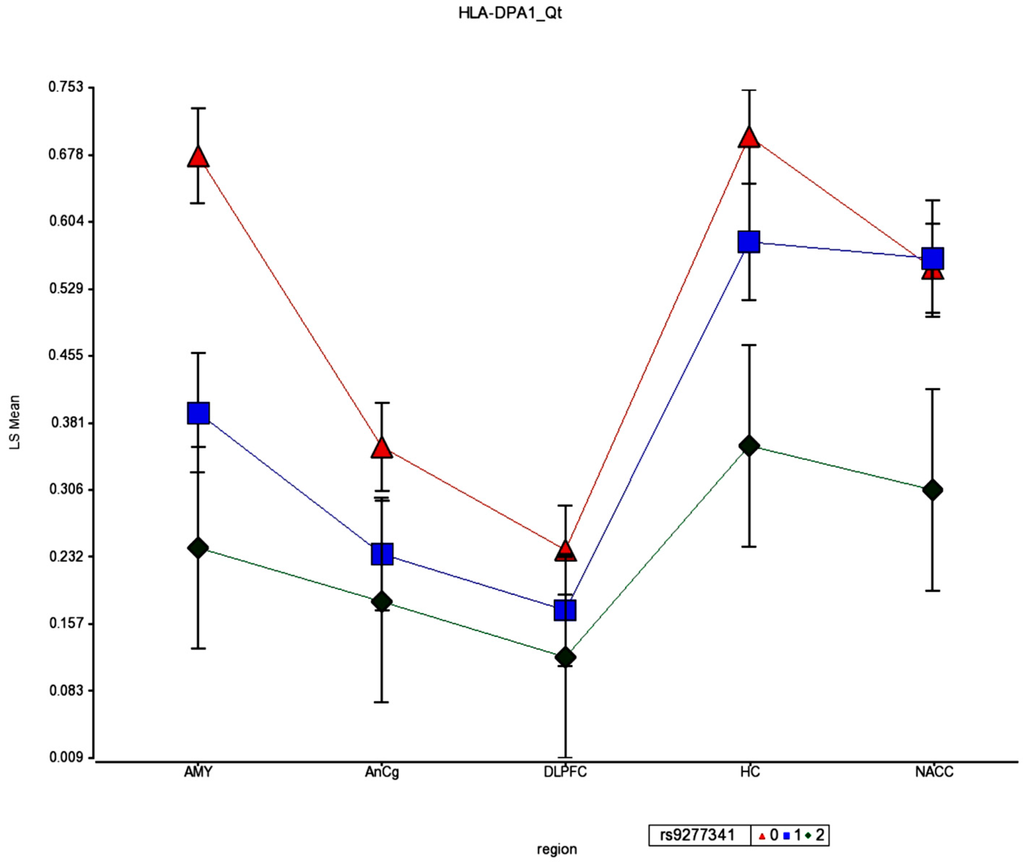 HLA-DPA1 expression evaluated with main effects of genotype (rs9277341), brain region, and diagnosis by ANCOVA. The effect of diagnosis was significant as shown.