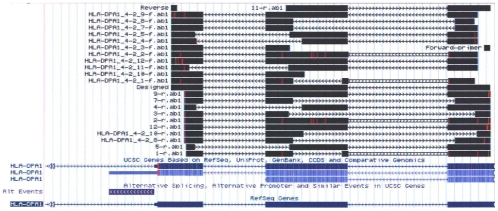 For more details, the next section shows the sequencing results for forward and reverse primers for HLA-DPA1_07 splicing site position from 427 to 641 in NM_033554 and the HLA-DPA1_01 splicing site at position 478 to 643 in NM_033554.
