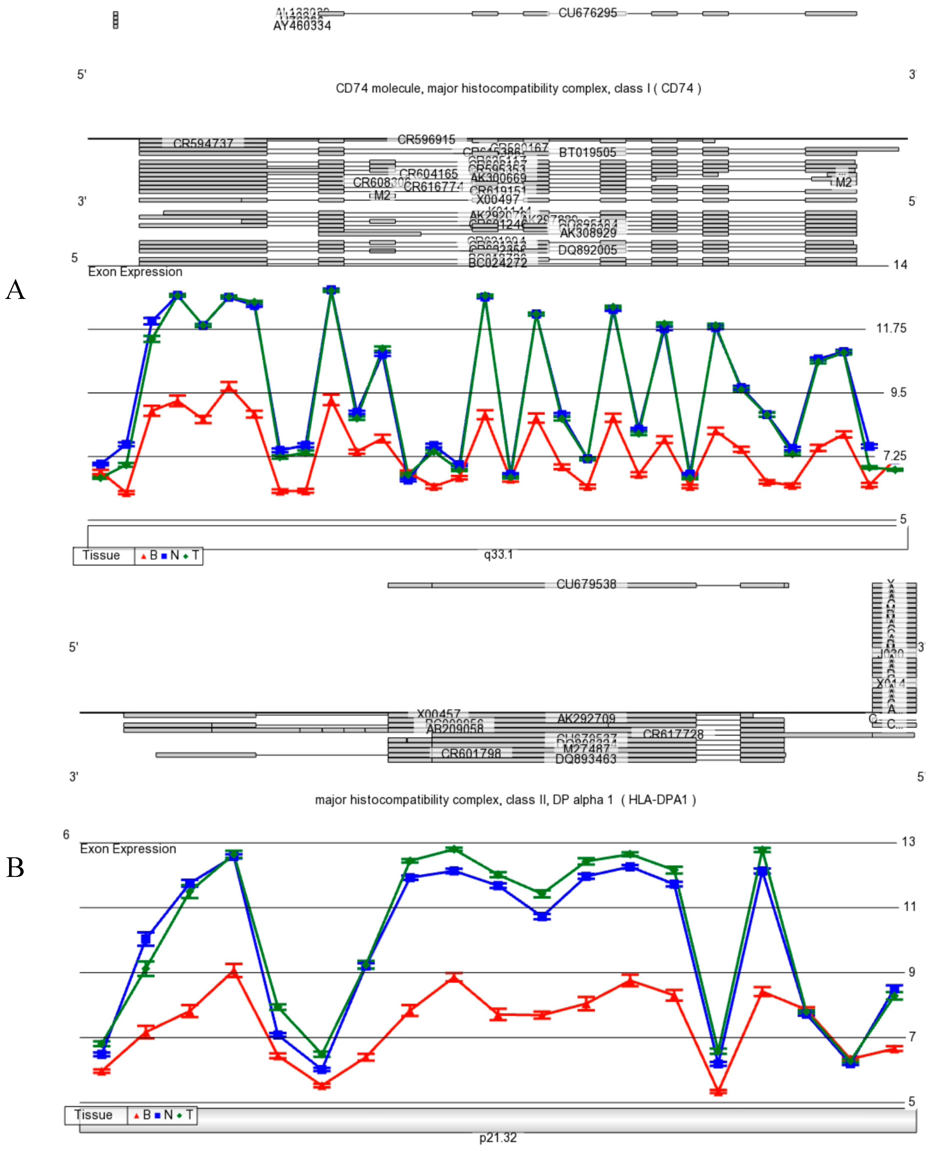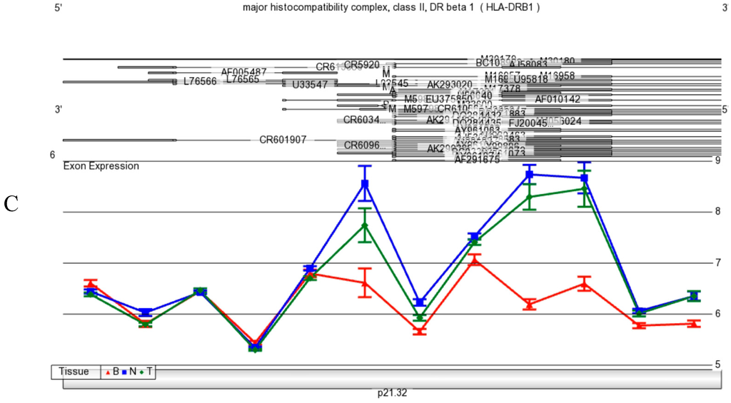 Exon microarray comparison of expression across brain samples (B), non-transformed whole blood samples and PBMC (N), and LCL EBV-transformed cell lines (T) for CD74 (Figure A); HLA-DPA1 (Figure B); and HLA-DRB1 (Figure C). In all three cases, the N and T levels (blood and immune cell levels) were higher than brain expression levels, and the higher expression levels by exon array were also confirmed by qPCR. The x-axis for each figure shows the probeset locations, and y-axis for each figure shows the probeset intensity in log2 scale.