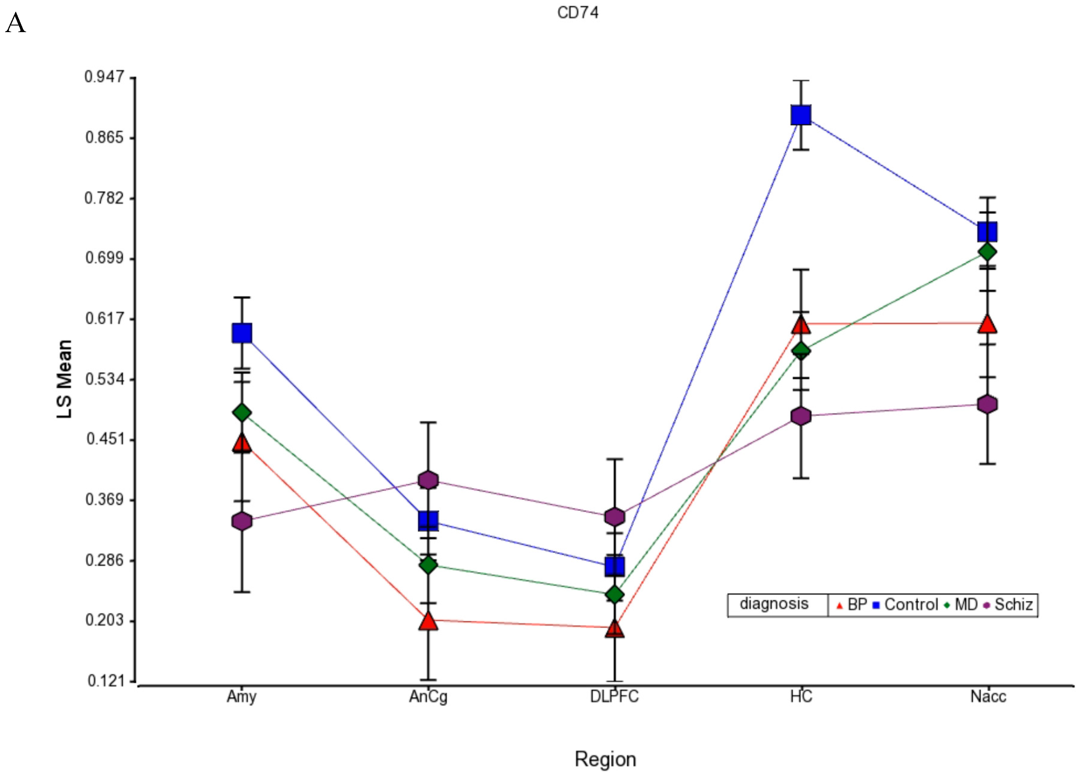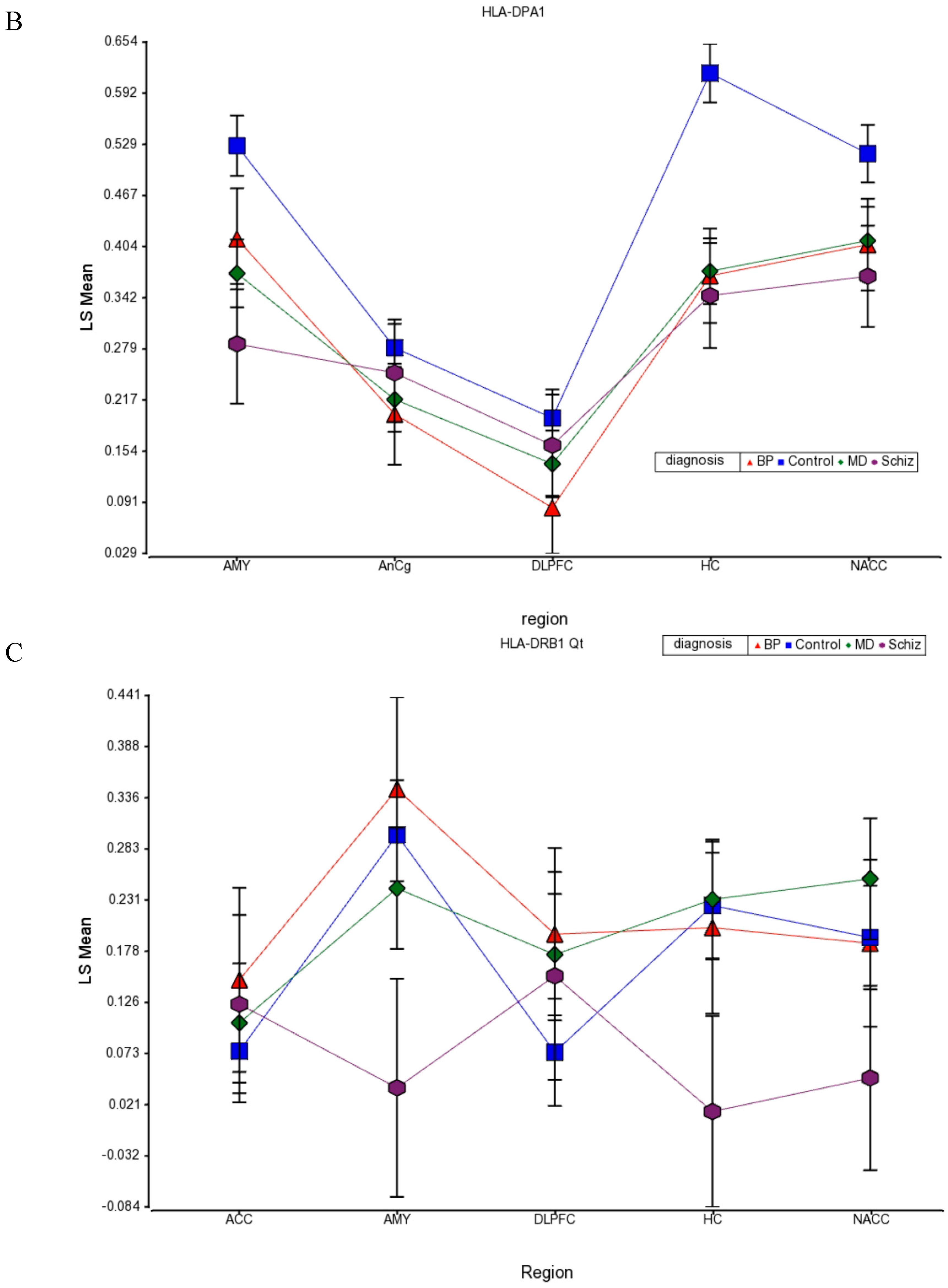 Highly significant main effects were found for HLA-DPA1 and CD74 (p-values < 10−20), and the resulting line plots are shown in Figure 5. For diagnosis effect, CD74 (p = 3.6 × 10−5) and HLA-DPA1 (p = 1.7 × 10−7) were significant, while HLA-DRB1 did not reach significance (p = 0.078). Only CD74 was significant for region by diagnosis interaction. Regional analyses were conducted and comparison results are shown in Table 7 A,B,C. The lack of findings for HLA-DRB1 in all brain regions by qPCR is consistent with the exon microarray findings. Three neuropsychiatric disorder groups (SZ, MDD, and BD) had a significantly lower expression of HLA-DPA1 in the hippocampus. Further, CD74 and HLA-DPA1 showed concordant expression at the brain region level, suggesting broad co-expression. SZ showed reduced expression in similar regions as CD74 and HLA-DPA1. HLA-DRB1 showed a variable relationship across diagnosis and brain regions, and, due to higher cycle numbers, might not be reliably detected in brain, at least the isoform that we measured by qPCR.