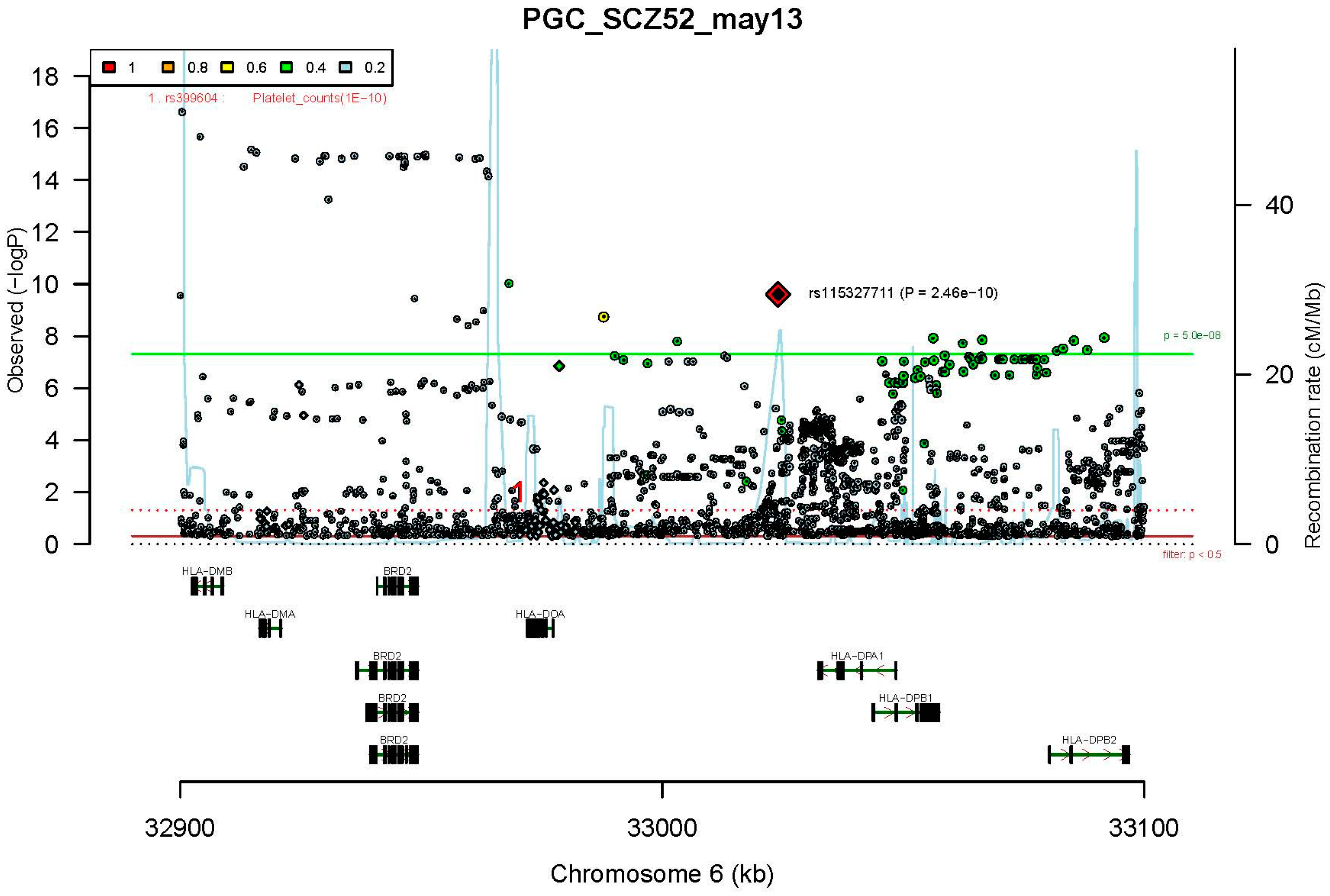MHC region association to schizophrenia [18] shown for 32.9–33.1 Mb. A strongly associated SNP with schizophrenia (rs115327711) is located at chr6:33,024,031 (association p = 2.46 × 10−10, OR = 1.1956) and shown in large red triangle. The HLA-DPA1 eQTL rs9277341 is 15 kb upstream at chr6:33,039,625.