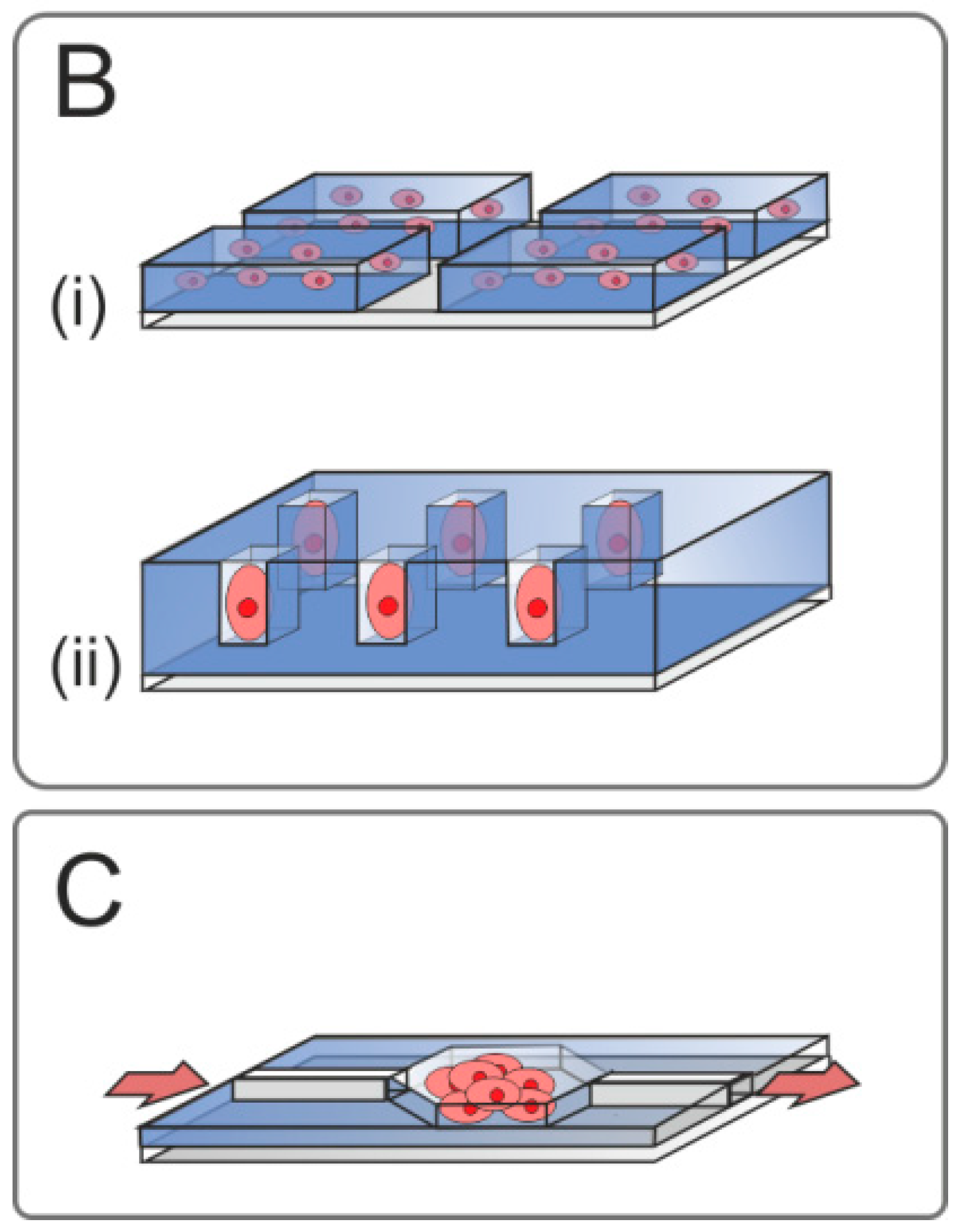 Figurative overview of living cell microarrays (LCMAs) described in this review. (A) 2D platforms; (i) undirected adsorption of cells on passivated LCMAs with partially unpassivated surface areas; (ii) LCMAs coated with biomaterials for enhanced cell attachment and stimulation, inclusively transfected cell microarrays; (iii) affinity-based immobilization of cells; (B) LCMAs for simulations of in vivo microenvironments and cell stimulation; (i) 3D cell constructs; (ii) microarrays with microstructured surfaces; (C) microfluidic devices with organoids.