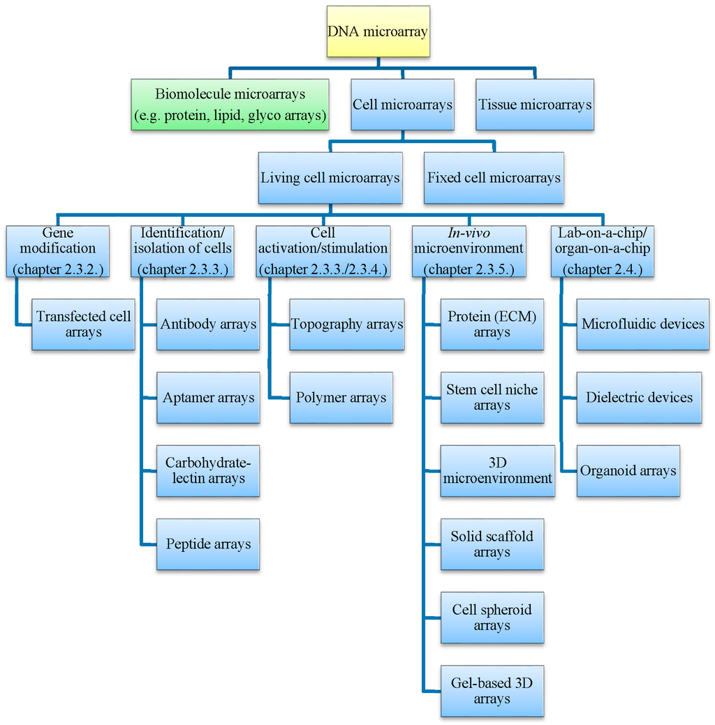 Several approaches for microarray platforms are currently under development in order to create a physiologically relevant microenvironment. If cell reaction upon stimuli should be obtained, cells have to be provided with passive (stiffness, geometrical clues) and active (biological and chemical signals, cell–cell contacts) microenvironment conditions. For example, the in vivo microenvironment of cancer cells is composed of different types of neighboring cells, various chemical gradients, low oxygen concentration, high metabolite concentration, and a mechanical surrounding, resulting in a much more complex system than the one available in a simple monolayer of spotted cancer cells. Moreover, primary cells are sensitive to outer stimuli and change their physiology in simple monolayer cultures in comparison to a true in vivo situation. There are two major types of cell-based microarrays, which aim to mimic the in vivo microenvironment: (1) cell niche microarrays; (2) 3D cell culture microarrays.