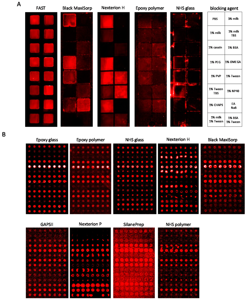 Evaluation of slide-based solid supports for antibody microarrays. The supports were compared with respect to blocking buffer, surface fouling, spot morphology and signal strength. (A) The slides (no antibodies printed) were first blocked and then incubated with crude, labelled serum and scanned after washing. Any observed signal intensity represents non-specific background binding. Representative scans of FAST, black MaxiSorp, Nexterion H, epoxy polymer and NHS glass slides are shown. The blocking agents tested are shown to the right; (B) Scanned microarray images of 14 × 8 antibody microarrays on epoxy glass, epoxy polymer, NHS glass, Nexterion H, black MaxiSorp, GAPSII, Nexterion P, Silane-Prep and NHS polymer slides. The printed antibody arrays were blocked and then incubated with crude, labelled serum before scanning.