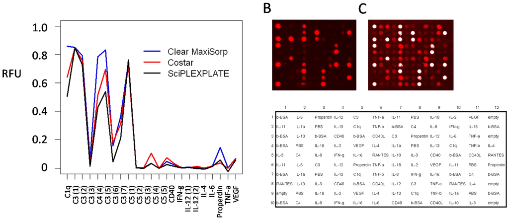 Three 96-well plates, SciPLEXPLATE, Costar and clear MaxiSorp, were evaluated as well-based solid supports. To this end, 23-plex antibody microarrays were printed and applied for serum protein profiling, using an LED/CCD-based plate scanner for sensing. The results showed that adequate spot morphology, low surface fouling and similar binding patterns were obtained on all three supports (Figure 5A). Still, the clear MaxiSorp plates generated higher signal intensities for at least a subset of antibodies (e.g., C1q, C3 and properdin), and this plate was therefore selected as the well-based solid support for the remaining part of the study.