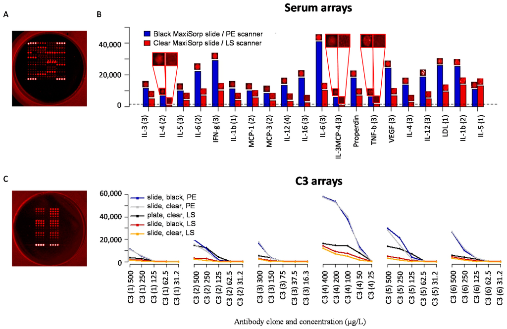 Next, we compared the performance of well-based arrays on clear MaxiSorp plates (LED/CCD plate scanner) with that of slide-based arrays on black MaxiSorp slides (confocal slide scanner, denoted PerkinElmer (PE) scanner). The results showed that similar signal intensities were obtained targeting high- to medium-abundant serum analytes (e.g., complement proteins), indicating equal performance (data not shown). However, when instead, predominantly low-abundant serum analytes (e.g., cytokines) were targeted, the observed binding patterns differed, with less analytes being detected on well-based arrays (Figure 5B) than on planar arrays (Figure 5C). Hence, the data indicated that the assay sensitivity was higher for the slide-based array set-up than for the well-based array set-up.