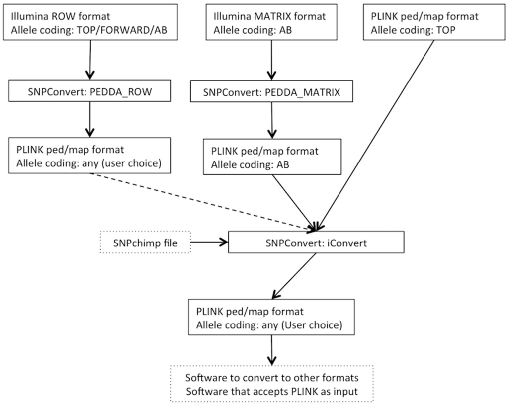 Here, we present the SNPConvert suite, a simple set of programs to convert any Illumina raw file format (both row and matrix formats) to a PLINK basic format (see [,] for specifics on this format) and to modify the allele coding and update the genomic coordinates of any PLINK file, irrespectively of the technology used to produce the genotypes. This set of programs, released both as multi-platform source code intended for command line access and as a simplified graphical user interface (GUI) for Windows and Mac users, is able to solve most common problems any researcher, irrespectively of its programming skills, has to face when integrating multiple SNP array datasets. Although we report on file format conversion for the Illumina technology, similar tools are available for Affymetrix-based genotypes [,,]. However, note that Affymetrix and Illumina data cannot be integrated directly, as SNP IDs and the allele calling process are not consistent in the two genotyping technologies.