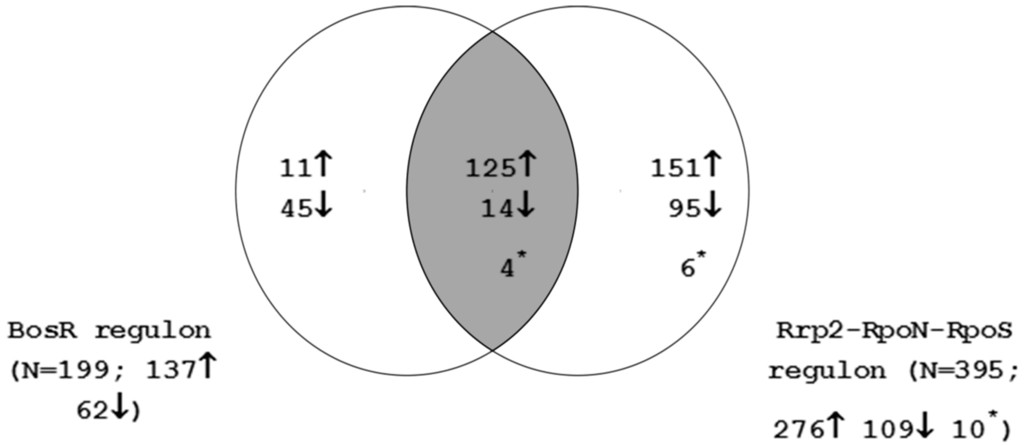 Overlap between the Rrp2-RpoN-RpoS and BosR regulons. Numbers indicate the count of genes that show statistically significant induction (up arrow) or repression (down arrow). Asterisk indicates genes that are induced in one regulon and repressed in the other.