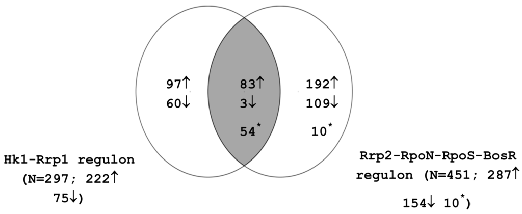 Interplay between the Rrp2-RpoN-RpoS-BosR and Hk1-Rrp1 regulons. Numbers indicate the count of genes that show statistically significant induction (up arrow) or repression (down arrow). Asterisk indicates genes that are induced in one regulon and repressed in the other.