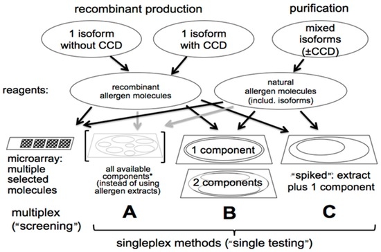 Four assay formats which employ recombinant (with and without carbohydrate cross-reactive determinants or CCDs) and native purified allergens. CCDs confound specificity assessment especially with Hymenoptera venom specific IgE assays. Thus, the use of allergenic molecules without CCDs aid in more accurately defining the true allergenic specificity of the IgE antibody response. The microarray multiplex format (left assay) is used by the immunosorbent allergen chip or ISAC. It involves 112 individual allergens in triplicate arrays that are immobilized on an amine-activated chip. * A mixture of components from a single allergen specificity can be used to mimic an unpurified extract that often has extraneous non-allergenic material together with allergens. The arrows indicate the type of allergosorbents where recombinant and natural allergenic molecules can be effectively used. Adapted with permission from [8].