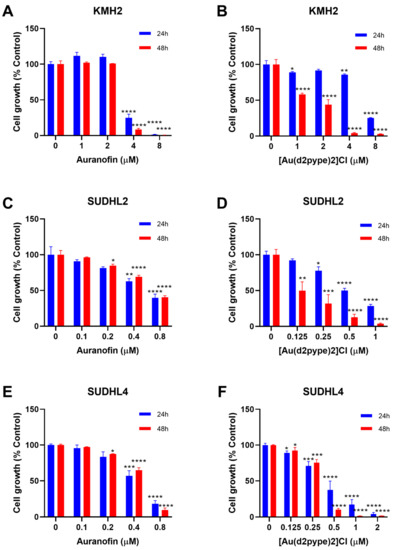 [Au(d2pype)2]Cl and auranofin inhibit lymphoma cell growth in lymphoma cells. (A) KMH2, (C) SUDHL2, and (E) SUDHL4 cells were treated with indicated concentrations of Auranofin for 24 and 48 h. (B) KMH2, (D) SUDHL2, and (F) SUDHL4 cells were treated with different concentrations of [Au(d2pype)2]Cl for 24 and 48 h. Cell growth was detected by MTT assay. Treated cells were compared with the untreated cells. Data were analysed by one-way ANOVA using Dunnett’s post-test. Values indicate mean ± SEM (n = 3). * p < 0.05, ** p < 0.01, *** p < 0.001, **** p < 0.0001.