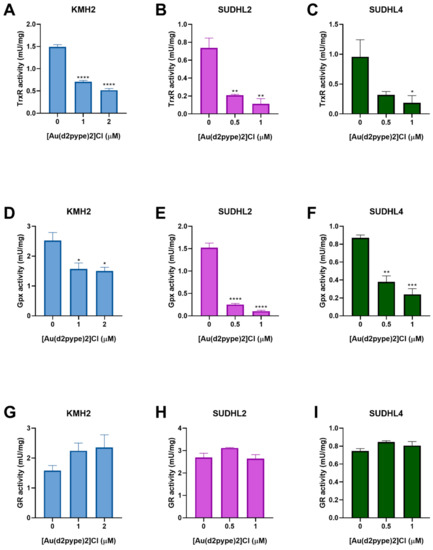 [Au(d2pype)2]Cl inhibits the selenoprotein activity in lymphoma cells. KMH2, SUDHL2, and SUDHL4 cells were treated with the indicated concentrations of [Au(d2pype)2]Cl for 24 h. Protein lysates were prepared and TrxR activity (A–C), Gpx activity (D–F), GR activity (G–I) was measured. Results were analysed by one-way ANOVA using Dunnett’s post-test. Values indicate mean ± SEM (n = 3). * p < 0.05, ** p < 0.01, *** p < 0.001, **** p < 0.0001.