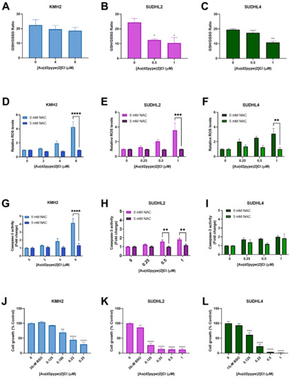 The GSH/GSSG ratio is regarded as a marker for oxidative stress. Under physiological conditions, the GSH/GSSG ratio is approximately 100:1 in resting cells. However, in oxidative stress models, the ratio can be decreased to 10:1 or less [41,42]. Results showed that the GSH/GSSG ratio was significantly decreased in ABC-DLBCL (SUDHL2) and GCB-DLBCL (SUDHL4) cells treated with 0.5 μM and 1 μM [Au(d2pype)2]Cl, respectively, after 24 h. The ratio was decreased to approximately 10:1 in both SUHDL2 and SUDHL4 cells (Figure 4B,C). However, there was no significant change observed in HL (KMH2) cells after [Au(d2pype)2]Cl treatment (Figure 4A).