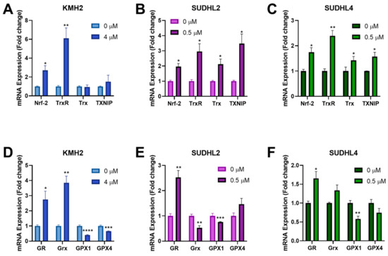 The Nrf-2 transcription factor can be activated by ROS and induces expression of antioxidant genes through binding to the antioxidant response elements in their gene promoters [45]. Since [Au(d2pype)2]Cl was shown to induce higher ROS levels in lymphoma cells (Figure 4D–F), RT-qPCR was performed to determine the effect of [Au(d2pype)2]Cl on Nrf-2 related antioxidant genes response. The results showed that several antioxidant genes were upregulated after [Au(d2pype)2]Cl treatment (Figure 5). In all lymphoma cells, Nrf-2 mRNA expression was significantly increased by approximately 2-fold. In KMH2 cells, analysis of the Trx system gene expression showed that only a significant upregulation of TrxR mRNA was observed (Figure 5A). However, the mRNA level of TrxR, Trx, and TXNIP in SUDHL2 and SUDHL4 cells was statistically significantly increased after [Au(d2pype)2]Cl treatment (Figure 5B,C). With respect to the GSH system, the mRNA level of GR significantly increased, while the mRNA of GPX1 significantly decreased in all lymphoma cells (Figure 5D–F). The Grx mRNA expression also significantly increased in KMH2 cells after [Au(d2pype)2]Cl treatment (Figure 5D); however, a significant decrease was observed in SUDHL2 cells (Figure 5E). The GPX4 mRNA was only significantly decreased in KMH2 cells.