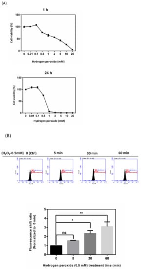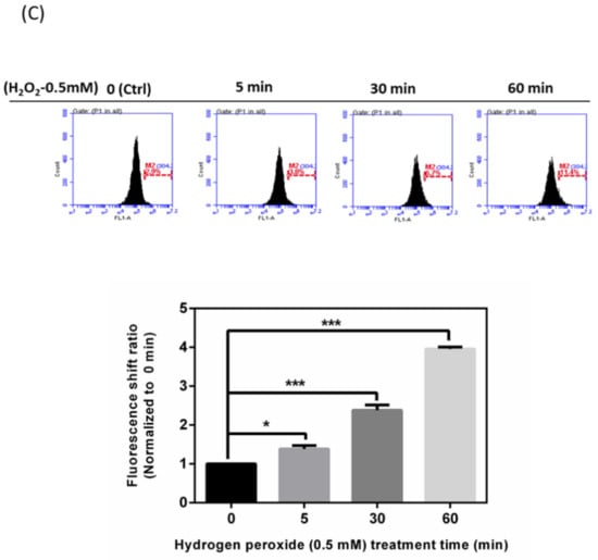 Hydrogen peroxide (30%) was purchased from Sigma-Aldrich (Thermo Fisher Scientific Inc., Waltham, MA, USA). Before the treatment, we first prepared the solution with a final concentration of 20 mM in serum-free medium. The reagent was diluted to specific concentration in serum-free medium before addition to the cells. After the duration time, we stopped the H2O2 treatment with twice 1× phosphate buffered saline (PBS) washing, and further followed by ROS reagent staining, apoptosis assay, Western blot sample preparing, or other functional assays.