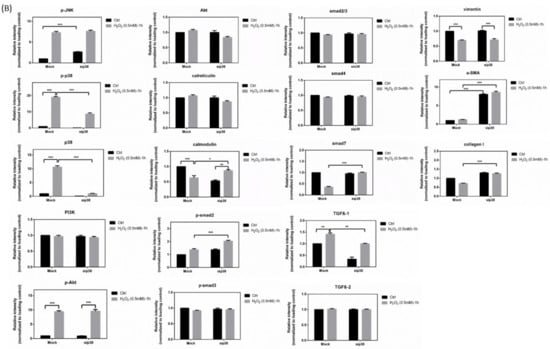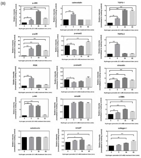 Immunoblot analysis and identification of H2O2-induced oxidative stress response signaling pathways. (A) Cells were collected after treatment with specific H2O2 concentration (0.5 mM) for 5, 30, and 60 min, and cellular extracts were immunoblotted with p-JNK, JNK, p-p38, p38, PI3K, p-AKT, AKT, calreticulin, calmodulin, p-SMAD2, p-SMAD3, SMAD2/3, SMAD4, SMAD7, transforming growth factor (TGF)β-1, TGFβ-2, vimentin, α-SMA, and collagen I, as shown with protein bands. Oxidative stress-dependent increases in ECM proteins, stress response, and TGF-β family members were observed over time. Numbers under each protein band reflect the densitometry value. (B) The protein expression intensities were quantified in relation to the loading control. Statistic chart were represented as means ± SEM. *, p < 0.05; **, p < 0.01; ***, p < 0.001 (n = 3).