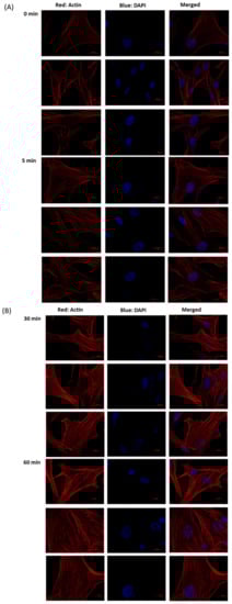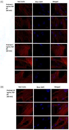 Immunofluorescence analysis of H2O2 (1 mM)-treated HTMCs. Photomicrograph of HTMCs with H2O2-treatment for (B) 30 and 60 min expressing more abnormal stress fiber formation, i.e., much denser and thicker compared to the (A) control and at a 5 min duration. HTMCs were treated with H2O2 on 12 mm coverslips for various exposure times (5, 30, 60 min) and were fixed and stained with phalloidin and 4′,6-diamidino-2-phenylindole (DAPI). (C,D) HTMCs pretreated with rhTGF-β1 in different concentrations (1, 5, 10 ng/mL) were observed for the prevention of fibrosis. The same exposure was used for each set of fields and the images are reflective of three different fields (scale bar = 20 µm).
