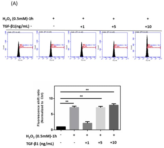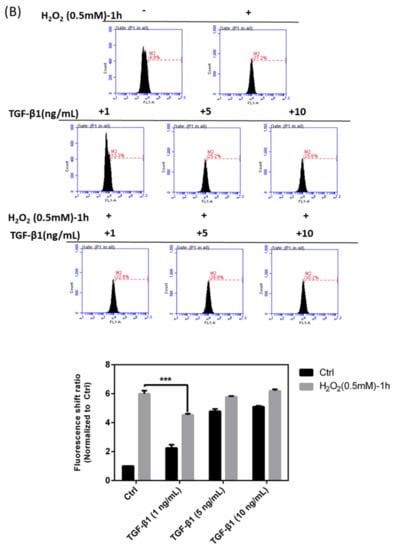 HTMCs were pretreated with rhTGF-β1 at different concentrations (1, 5, and 10 ng/mL), and intracellular ROS, Ca2+ content, and cell apoptosis status were investigated. Following pretreatment with rhTGF-β1 (1, 5, 10 ng/mL), H2O2 (0.5 mM)-induced oxidative stress was prolonged for 1 h. Data showed that rhTGF-β1 (1 ng/mL) pretreatment reduced the amount of ROS (decreased the peak-shift ratio from 7.5 to 2) and cell apoptosis rate (29.6% to 16%), while it also enhanced survival; groups with rhTGF-β1 (5 ng/mL) pretreatment showed no difference from the H2O2-only group no matter the fluorescence shift ratio of ROS increase (remained around 7.5 times normalized to Ctrl) or cell apoptosis percentages (29.6% to 30.2%), and groups with rhTGF-β1 (10 ng/mL) pretreatment experienced an increased cell apoptosis rate (29.6% to 32%) and amount of ROS (up to 8.3-fold) (Figure 4A,B,D). Meanwhile, it was shown that groups with rhTGF-β1 (1 ng/mL) experienced a decrease in peak-shift percentages of intracellular Ca2+ concentration from 5.5-fold to 3.8-fold. (Figure 4C). Interestingly, although the data surrounding ROS increase with rhTGF-β1 (1, 5, 10 ng/mL)-only groups indicated formation of intracellular ROS, the concentration of 1 ng/mL totally demonstrated its protective effects on HTMCs with H2O2-induced oxidative stress.