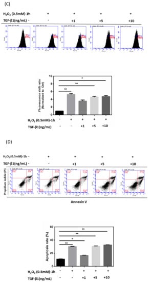 The absence or over-presence of the complicated protein, TGF-β, accompanied by oxidative stress can lead to an enhanced amount of ROS and cell abnormalities. We also observed that different concentrations of added TGF-β1 cause totally different and bilateral effects: (a) pretreatment with rhTGF-β1 (1 ng/mL) followed by H2O2 treatment reduced amount of ROS, the cell apoptosis rate, and the protein expression ofcollagen I and laminin, while enhancing survival; (b) groups with rhTGF-β1 (5 ng/mL) pretreatment showed no difference to the H2O2-only group regardless of ROS increase or cell apoptosis percentages, while there was elevated intensity of collagen I and laminin; (c) groups with rhTGF-β1 (10 ng/mL) pretreatment experienced an increased cell apoptosis rate and amount of ROS (Figure 4, Figure 5 and Figure 6).