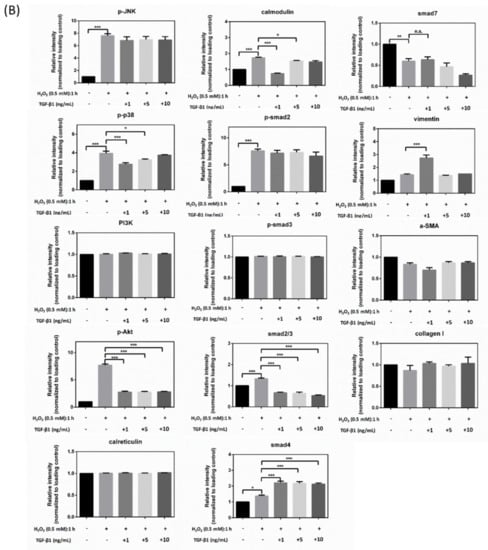 Immunoblot analysis and identification of rhTGF-β1 protein in oxidative stress pathways. (A) Cells were collected after treatment with specific rhTGF-β1 concentrations (1, 5, 10 ng/mL) followed by H2O2 (0.5 mM) treatment for 1 h, and cellular extracts were immunoblotted with p-JNK, JNK, p-p38, p38, PI3K, p-AKT, AKT, calreticulin, calmodulin, p-SMAD2, p-SMAD3, SMAD2/3, SMAD4, SMAD7, vimentin, alpha-smooth muscle actin (α-SMA), and collagen I as shown with the protein bands. Oxidative stress-dependent increases in ECM proteins (vimentin), stress response, and Ca2+-modulated proteins were observed over time. Numbers under each protein band reflect the densitometry value. (B) The protein expression intensities were quantified in relation to the loading control. Statistic chart were represented as means ± SEM. *, p < 0.05; **, p < 0.01; ***, p < 0.001; n.s., non-significant; (n = 3).