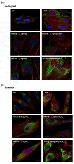 Subsequently, to further elucidate the role and threshold of TGF-β and whether TGF-β promotes anti-oxidative pathways or triggers much more oxidative stress, thereby leading to severe fibrosis, we established immunofluorescence analysis experiments with rhTGF-β1 protein (1, 5, 10 ng/mL) and rhTGF-β1 protein followed by H2O2 treatment to track ECM protein markers, specifically collagen I (Figure 6A) and laminin (Figure 6B). Our results suggested that the groups with rhTGF-β1 (1 ng/mL) combined with H2O2-induced oxidative stress exhibited a lower intensity of collagen I and laminin, implying less progression of fibrosis.