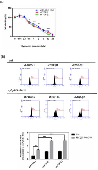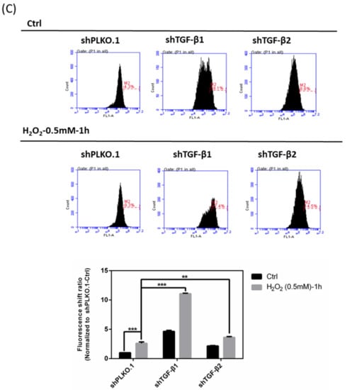 Effects of shTGF-β1 and shTGF-β2 knockdown in HTMCs with H2O2 exposure. (A) TGF-β1/2 knockdown HTMCs had decreased cell viability with H2O2 at different concentrations for 1 h when compared to the shPLKO.1 group (control). Data reflected that shTGF-β1/2 knockdown HTMCs were more susceptible and sensitive to oxidative stress. Values in the plots are normalized against the control group (shPLKO.1-Ctrl); Statistic chart were represented as means ± SEM. *, p < 0.05; **, p < 0.01; ***, p < 0.001; (n = 3, independent experiments). (B) Levels of ROS intensity for shTGF-β1/2 knockdown HTMCs with or without H2O2 treatment (0.5 mM) for 1 h. Data for shTGF-β1/2, especially shTGF-β1, knockdown HTMCs with H2O2 (0.5 mM) for 1 h showed greater ROS increase. Values in the plots are normalized against the control group (shPLKO.1-Ctrl); Statistic chart were represented as means ± SEM. **, p < 0.01; ***, p < 0.001; (n = 3, independent experiments). (C) Histograms depicting increased levels of Ca2+ contents in shTGF-β1 and shTGF-β2 knockdown HTMCs combined with H2O2 (0.5 mM) for 1 h of treatment. Values in the plots are normalized against the control group (shPLKO.1-Ctrl); Statistic chart were represented as means ± SEM. **, p < 0.01; ***, p < 0.001; (n = 3, independent experiments). (D) Apoptosis rate for shTGF-β1 and shTGF-β2 knockdown HTMCs combined with H2O2 treatment (0.5 mM) for 1 h. Cell death increased in shTGF-β1 and shTGF-β2 knockdown groups followed by H2O2-induced oxidative stress. Values in the plots are normalized against the control group (shPLKO.1-Ctrl); Statistic chart were represented as means ± SEM. **, p < 0.01; ***, p < 0.001; (n = 3, independent experiments).