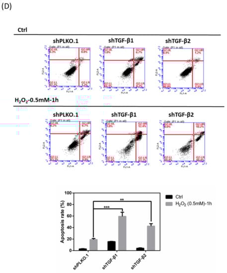 According to our previously described experimental data, we could now conclude that HTMCs with a low concentration of rhTGF-β1 (1 ng/mL) exhibited protective effects in terms of antioxidation, while elevated concentrations of rhTGF-β1 (5 and 10 ng/mL) showed no benefit and even demonstrated aggravated damage. We then examined whether loss of TGF-β1/2 affects cell viability, intracellular ROS, and Ca2+ levels with H2O2 damage. Cell viability with respect to tolerance of H2O2 revealed that the shTGF-β1/2 knockdown group was more sensitive and susceptible to H2O2-induced oxidative stress (Figure 7A). Intracellular ROS significantly increased in the shTGF-β1/2 group with the same oxidative stress induced by H2O2 as that of shPLKO.1 (control group) (Figure 7B). Furthermore, [Ca2+]i was significantly elevated in the absence of TGF-β1/2, especially in the shTGF-β1 group (Figure 7C). Collectively, consistent with the aforementioned results, an increased cell apoptosis rate in the shTGF-β1 and shTGF-β2 groups with H2O2 treatment was observed (Figure 7D).